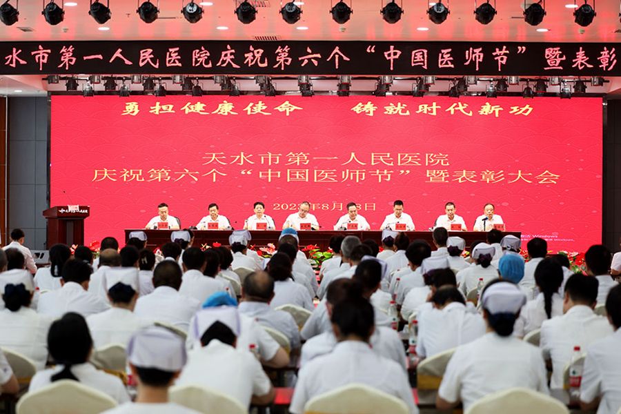 王定新指出,卫生健康事业关系人民群众健康和千家万户幸福。近年来,天水市卫健系统坚持以习近平新时代中国特色社会主义思想为指导,以深入推进健康天水建设为统领,着力完善医疗卫生服务网络,不断优化医疗卫生服务链条,持续提升医疗卫生服务能力,卫生健康重点工作纵深推进,全市卫生健康各项工作取得全面发展。王定新要求,市一院医务人员要以此次表彰大会为契机,落实市委、市政府及市卫健委有关要求,传承弘扬市一院优良传统,在新时代新征程上,切实担负起推进健康天水建设的重任,把个人的理想追求融入党和国家的卫生健康事业之中,为推进健康天水建设、保障人民健康再立新功。