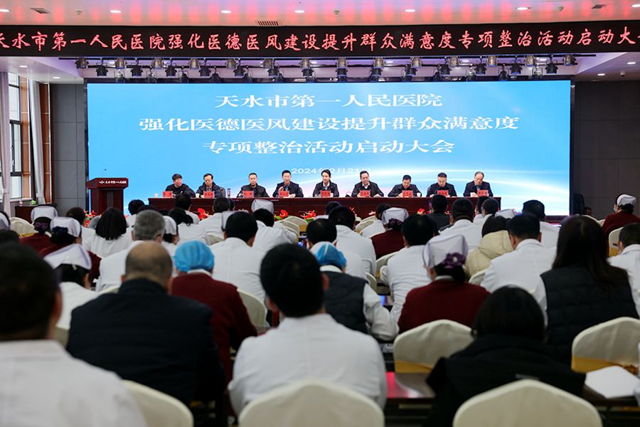 近日,天水市第一人民医院召开强化医德医风建设提升群众满意度专项整治活动启动会议。市卫生健康委党组成员、市纪委监委派驻市卫生健康委纪检监察组组长苟东波参加会议并讲话。院党委书记丁志杰作动员讲话。院领导班子成员、全体中层管理人员共200人参加会议。