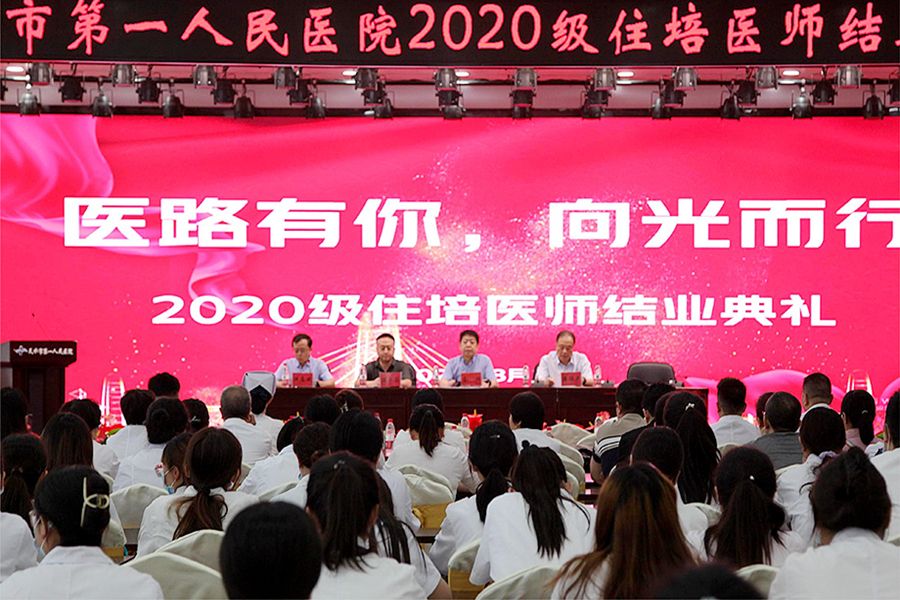 近日,市一院举行2020级住院医师规范化培训结业典礼。副院长洪志斌主持会议。院领导班子成员、各专业基地负责人、教学主任、教学秘书、带教老师代表及全体住培医师200多人参加仪式。