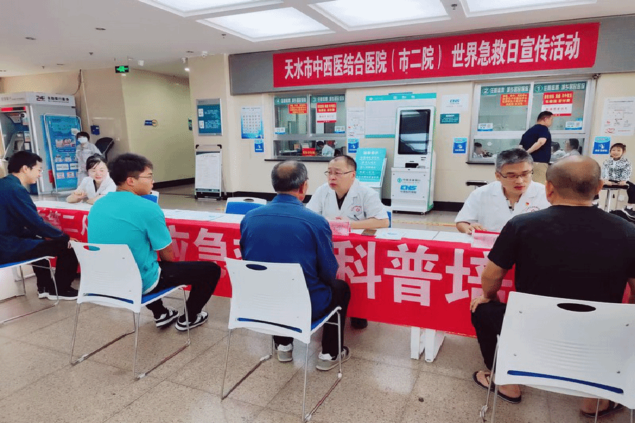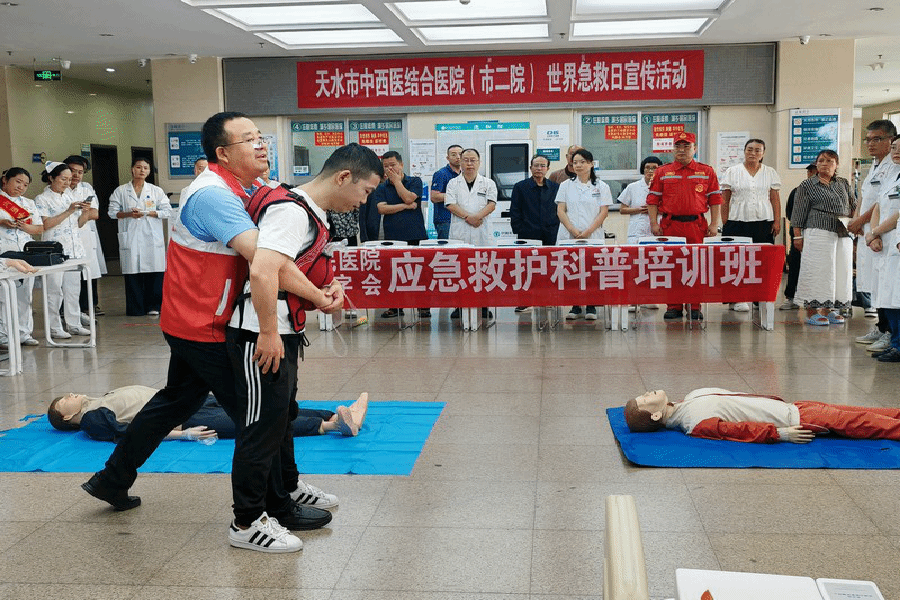 为科普急救知识,增强全院职工和广大群众应对突发事件及意外伤害的自救互救能力。近日,天水市中西医结合医院(市二院)联合麦积区红十字会在市二院住院部大厅组织开展以“急救与运动”为主题的第25个“世界急救日”急救知识普及宣传活动。区红十字会主要负责人和天津市西青医院“组团式”帮扶队队长徐雪军应邀出席并讲话。天津市西青医院“组团式”帮扶专家、甘肃省中医药大学见习学生和职工代表、来院就诊群众约130余人参加。