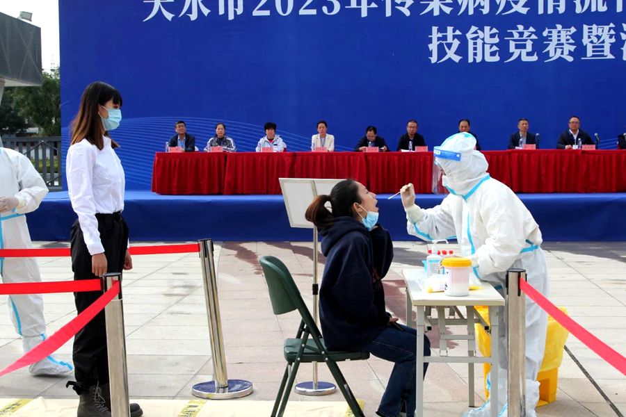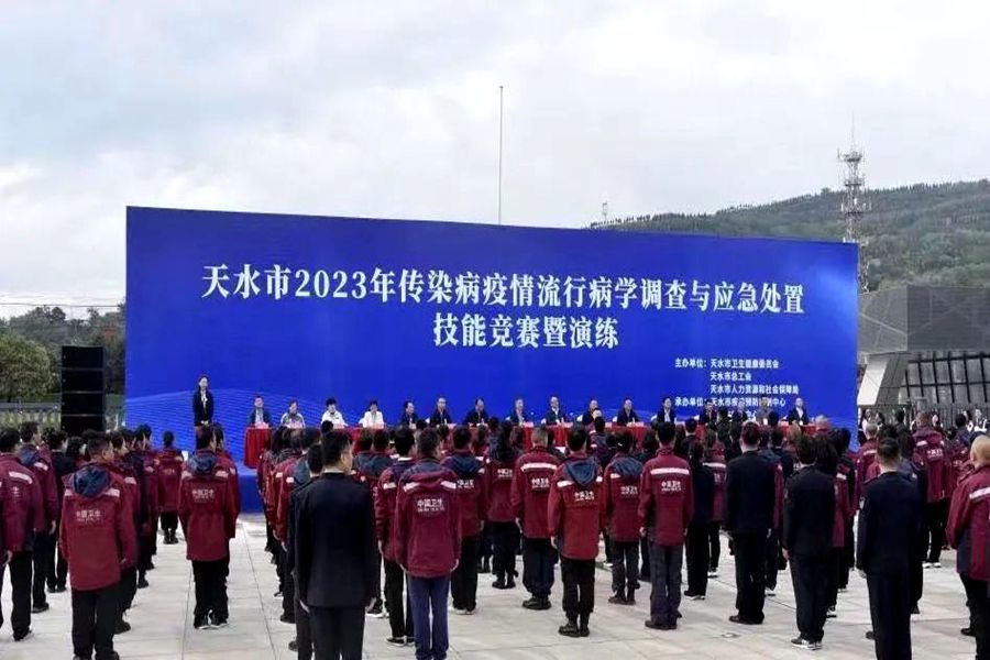 9月26日,为期一月的天水市2023年甘肃省百万职工劳动和技能竞赛暨天水市第六届职工职业技能运动会传染病疫情调查和应急处置技能竞赛演练在天水市体育中心圆满落幕。市卫生健康委党组书记、主任王定新,市总工会党组书记、常务副主席秦福才,市人社局党组成员、副局长刘宇,天水市疾控中心党委书记 、主任曹惠灵出席应急演练和表彰大会。市、县区共8支队伍300余名队员参加竞赛演练。