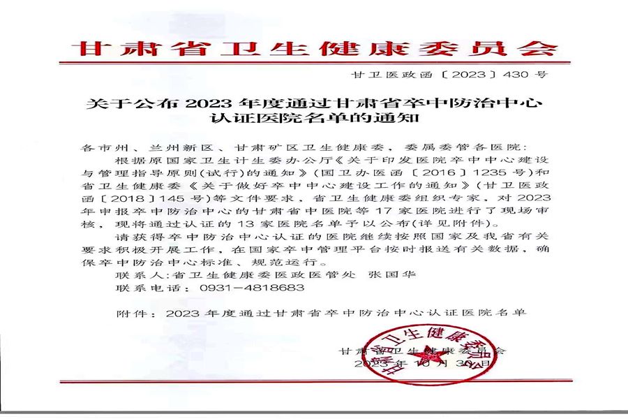 2023年10月30日,甘肃省卫生健康委员会下发《关于公布2023年度通过甘肃省卒中防治中心认证医院名单的通知》(甘卫医政函〔2023〕430号),我院卒中防治中心顺利通过评审认证,标志着我院多学科协作诊治卒中病人水平迈入新的台阶。
