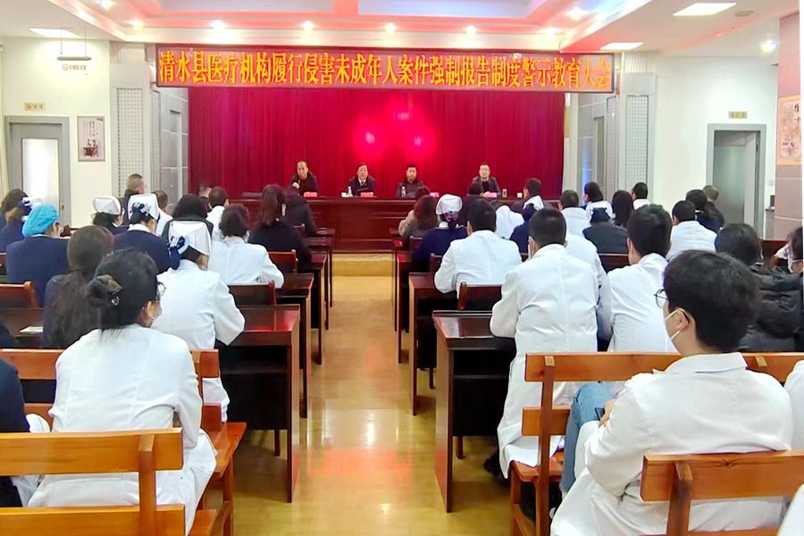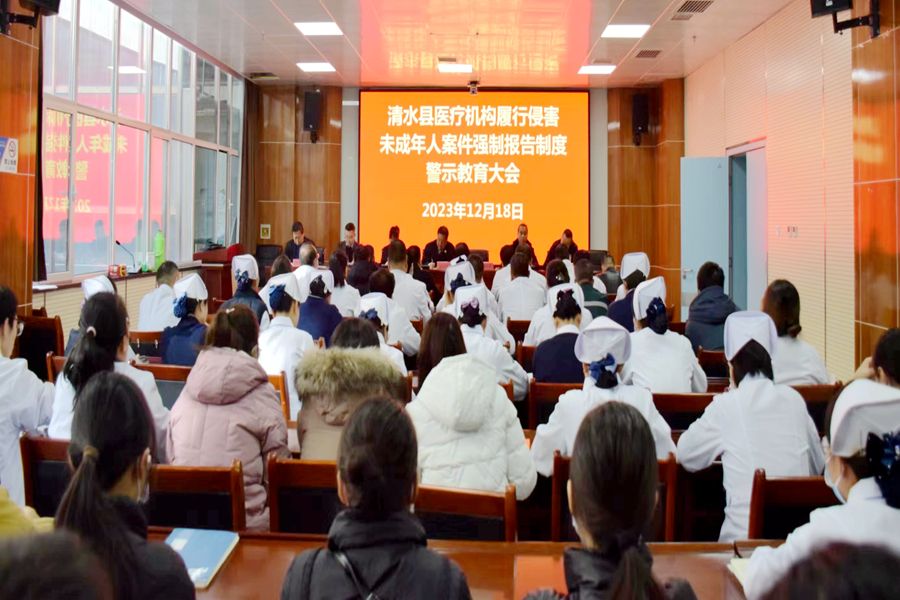 12月18日,清水县卫生健康局联合县人民检察院,分别在县人民医院 、县中医医院召开医疗机构履行侵害未成年人案件强制报告制度警示教育大会。县人民检察院党组副书记、副检察长宋天录,县卫生健康局党组书记、局长吴全玉出席会议并讲话。县卫生健康局党组成员、副局长巨喜君主持会议。