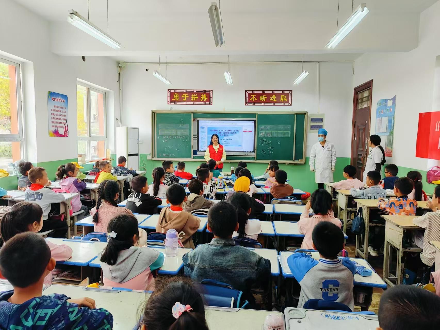 在关子镇中心小学,区卫健局工作人员为二年级三班的50多名同学们讲解了健康生活方式的重要性,以及“三减三健”科普知识,引导小学生们少吃糖等甜食,多运动,多参加校园体育活动,注意口腔卫生和健康,正确刷牙,养成健康卫生的生活习惯。同时,现场为同学们发放健康科普宣传品。