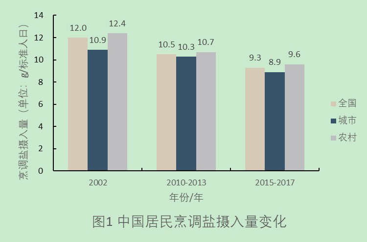 《中国居民营养与慢性病状况报告(2020年)》发布了中国居民烹调盐摄入量变化情况。2002年至2017年三次全国营养调查结果显示,烹调盐摄入量呈逐年下降趋势(图1)。中国居民平均每标准人日烹调盐摄入量从2002年的12.0克下降至2015-2017年的9.3克;城市居民从2002年的10.9克下降至2015-2017年的8.9克;农村居民从2002年的12.4克下降至2015-2017年的9.6克。