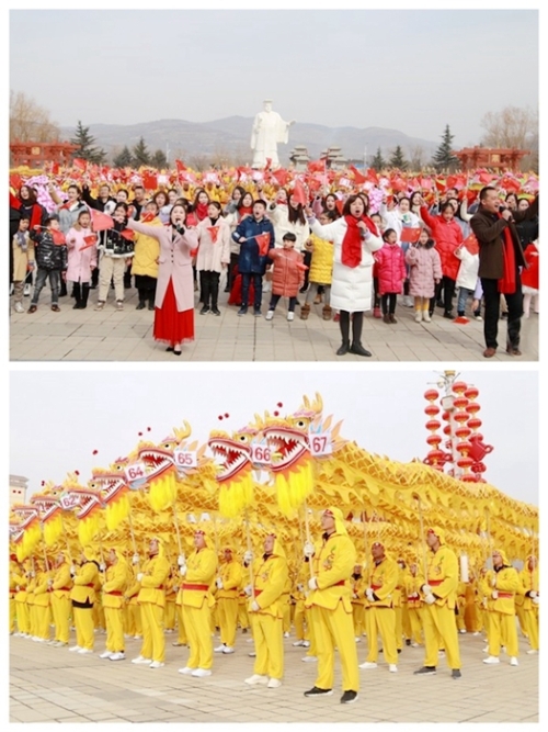 在欢快的鼓声中,龙腾盛世表演在整齐的鼓声中奔腾而出,舞龙表演共分为祥龙出宫、飞龙起舞、金龙团圆等几个片断。伴随着新春喜庆的锣鼓,县直六大口40多个单位700多位干部职工挥舞着70条巨龙,时而上下穿梭、时下腾空而起,时而你追我赶,如同大海搏浪,如同腾云驾雾,如同蛟龙出海,集中展示了清水儿女意气风发、乘势而上的时代精神。70条彩龙寓意为新中国成立70周年献礼,其中56条大龙象征56个民族,14条小龙象征着祖国的辉煌与发展,寓意在新的一年里民族团结,和和美美,欣欣向荣。