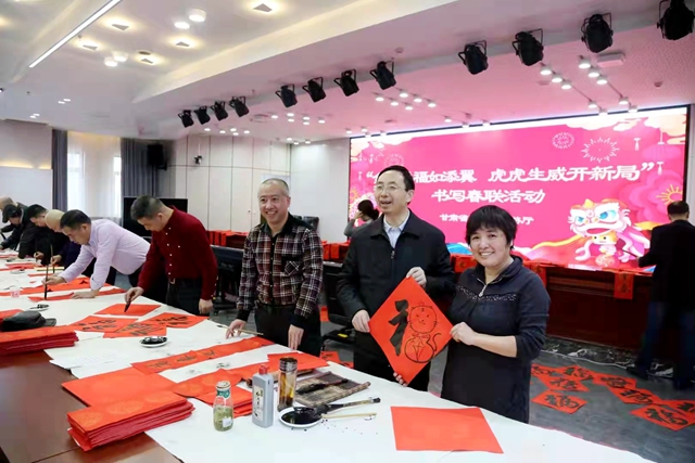 金虎送福如添翼,虎虎生威开新局。在传统农历虎年春节即将到来之际,为了营造欢乐祥和的节日氛围,弘扬中华优秀传统文化,1月25日,省文旅厅直机关党委组织甘肃画院和甘肃省文化馆的书法家开展了迎新春写春联送福字活动,为厅机关干部职工、社区人员写春联、送福字。活动共送出春联、“福”字600余副,使大家在传统文化韵味中感受芬芳年味,感受中华文化魅力。