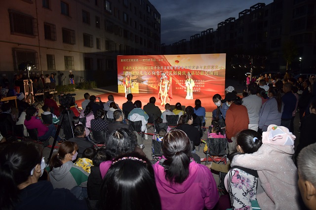 9月27日,文艺轻骑兵(云上河州文化演艺发展有限公司)在临夏县韩集镇双城易地搬迁服务中心开展了文化惠民演出,演出赢得了现场观众热烈掌声,极大地增强了搬迁居民们的幸福感和获得感,营造了喜庆祥和的节日氛围。(文/甘肃省文化和旅游厅 欧阳尔宝)