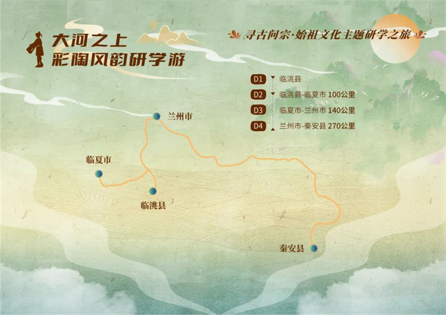 定西市【甘肃马家窑彩陶文化博物馆、马家窑遗址】—临夏回族自治州【临夏州博物馆、齐家坪遗址、半山遗址】—兰州市【金城关文化博览园、甘肃省博物馆、甘肃天庆博物馆】—天水市【大地湾遗址】