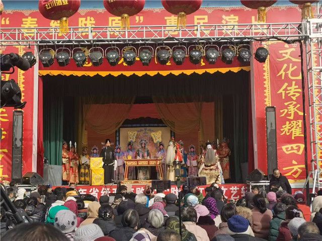 农历正月初九至正月十四,省秦腔艺术剧院在崆峒区激情演出,传统秦腔的铿锵之声与惠民演出的温情底色交织。演出现场人头攒动,白发苍苍的老人相互搀扶,带着自备的小马扎早早占据前排位置;年幼的孩子们被父母抱在怀中,小脸冻得通红却难掩兴奋之情。紧随其后,农历正月十六至正月十八,剧院又奔赴会宁县韩家集镇,三天六场秦腔大戏接连登台,为当地戏迷朋友的新春佳节增添了浓厚的文化色彩。