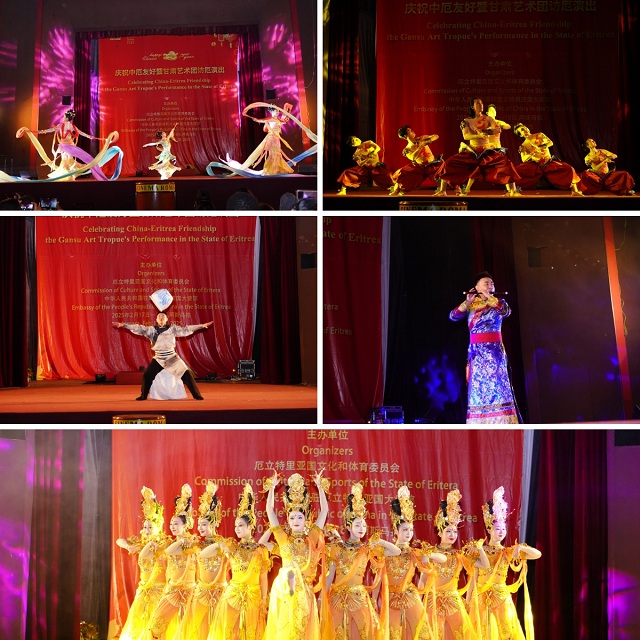 此次访演活动是应中国驻厄立特里亚大使馆和厄立特里亚文化和体育委员会邀请,受文化和旅游部委派,甘肃省文化和旅游厅承办。甘肃省歌舞剧院和甘肃省杂技团的艺术家们于2月17日和18日晚在厄首都阿斯马拉罗马剧院连演2场,厄立特里亚各方对演出给予高度评价。在厄期间,甘肃艺术团一行受到了厄文体委的热情接待。甘肃艺术团的精彩演出,以文化为纽带拉近了两国人民的距离,彰显了中国文化的独特魅力与多元价值。(文/甘肃省文化和旅游厅 王秀)