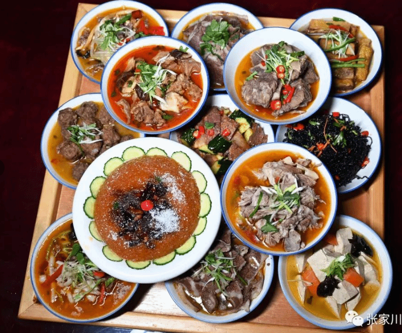 十三花是张家川回族招待宾客时规格最高的一种宴席,在盛大活动中才能见到,如婚嫁和举行大的宗教活动中,才以十三花待客。十三花是在一大方盘内,置以十三种不同的美味菜肴。在客人坐定并吃过果盘之后,一次端上,并连方盘一起放于桌上,供客人享用。“十三花”以其品种多样、精美可口、制作精细、营养丰富、干净卫生、色、香、味俱全、油而不腻、老少皆宜、颇具回族特色而著称,深爱广大群众的喜爱,从而成为婚丧嫁娶,招待亲朋好友的必备美味佳肴。(文/海激石 张家川县文体广电和旅游局)