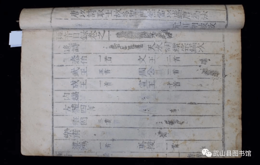 武山县图书馆自建馆以来,一直重视馆藏古籍的整理和保护工作,迄今共收馆藏古籍151部、2033册,其中包括善本47部,其中包括有元大德九年(1305)建康路儒学刻明国子监递修本1部、有明嘉靖、万历间的刻本14部、清康熙间刻本14部、乾隆间刻本18部,普通古籍104部。8部珍贵古籍申报国家珍贵古籍名录。在我馆存藏的这些古籍,主要涉及宗教、政治、军事、文学以及历史档案等方面。