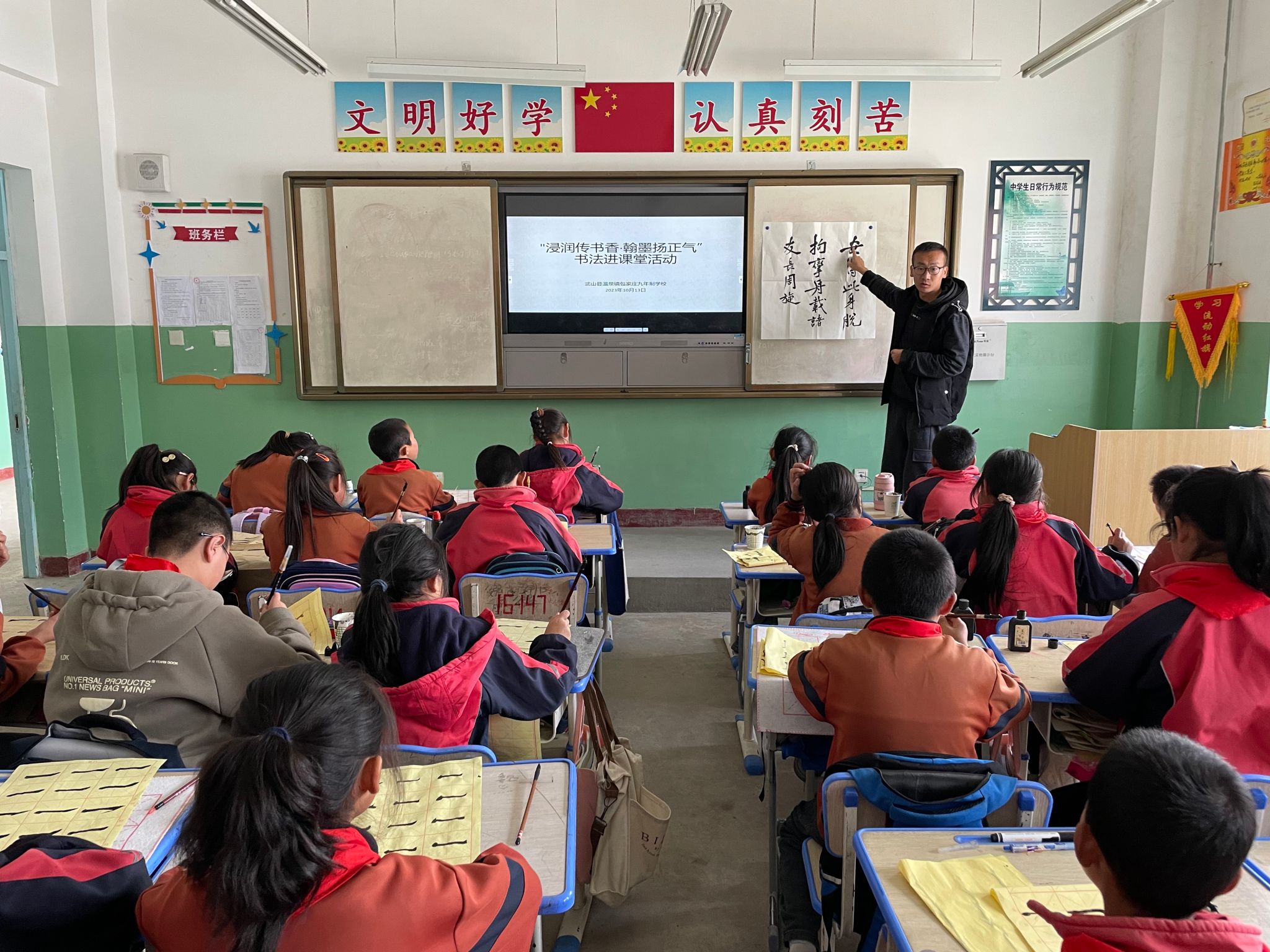 红叶映秋阳,校园翰墨香。10日13日,武山县文化馆组织的书法人员走进武山县温泉镇包家庄九年制学校,开展“浸润传书香 翰墨扬正气”书法进课堂活动。