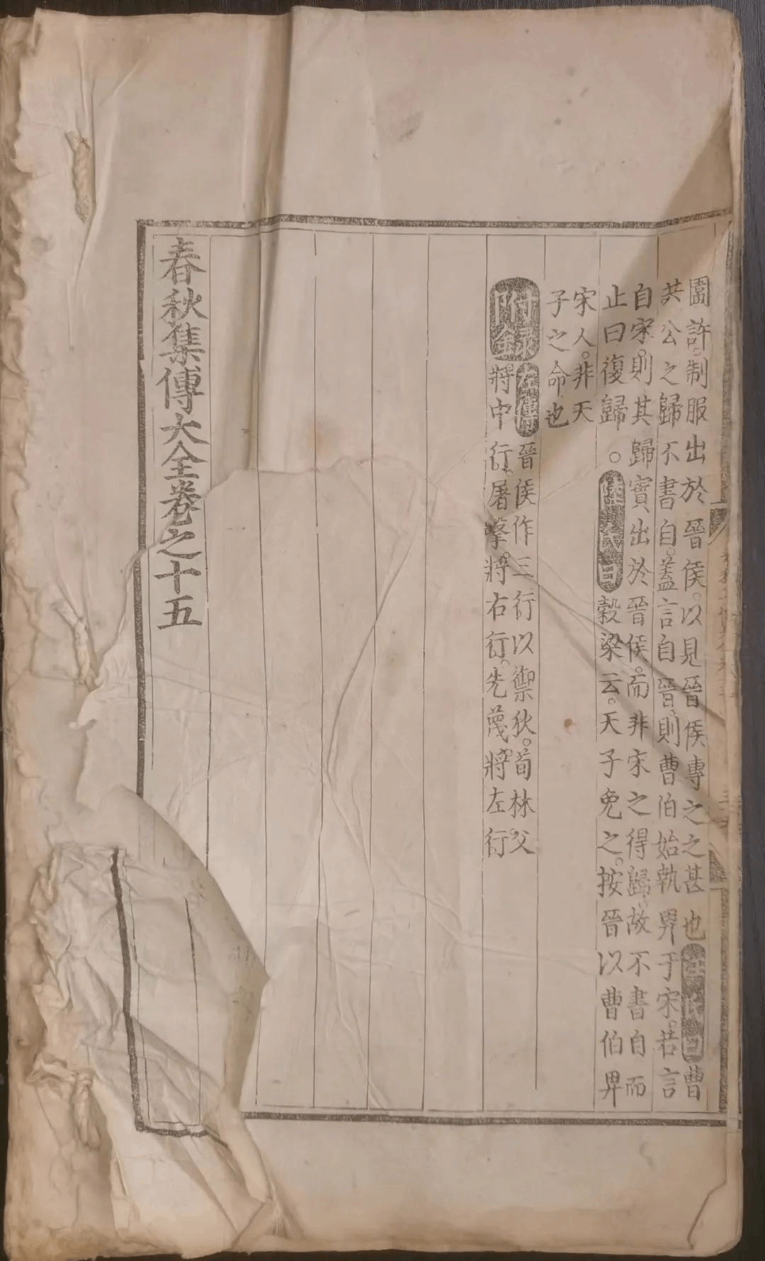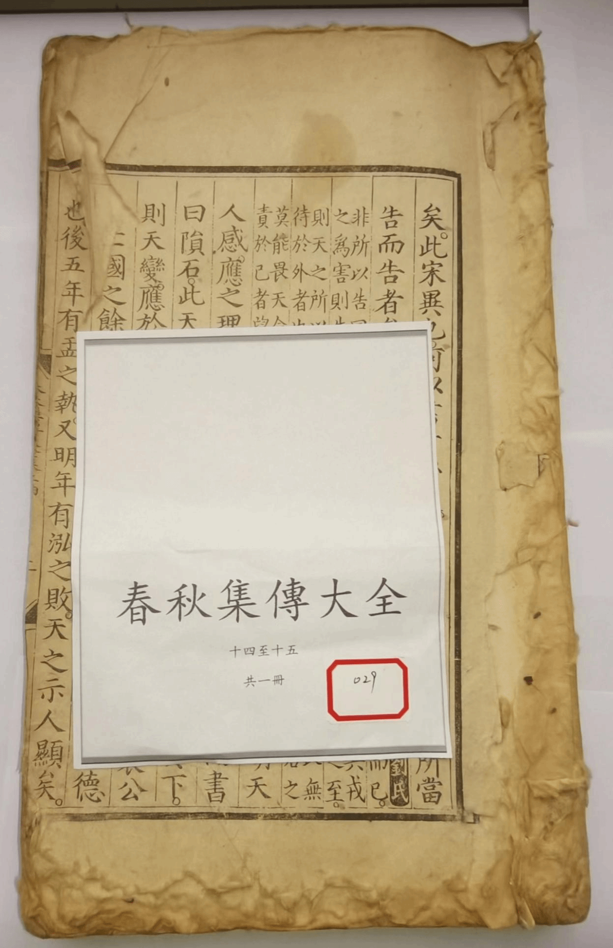 《春秋集传大全》共37卷18册。清水县图书馆藏《春秋集传大全》2卷1册,卷次为第14卷和第15卷。作者:胡广,字光大,号晃庵,江西吉水人,南宋名臣胡铨之后,建文二年(1400年)庚辰科状元,官至文渊阁大学士。永乐年间主持编纂此书并刊行,后为明一代取士范本。此书版式宽大,气势恢宏,开本36.6×24厘米,版框26.6×17.8厘米,正文半叶10行22字,小字双行同。双黑口,四周双边双花鱼尾,鱼尾中印有书名、卷次、页码。