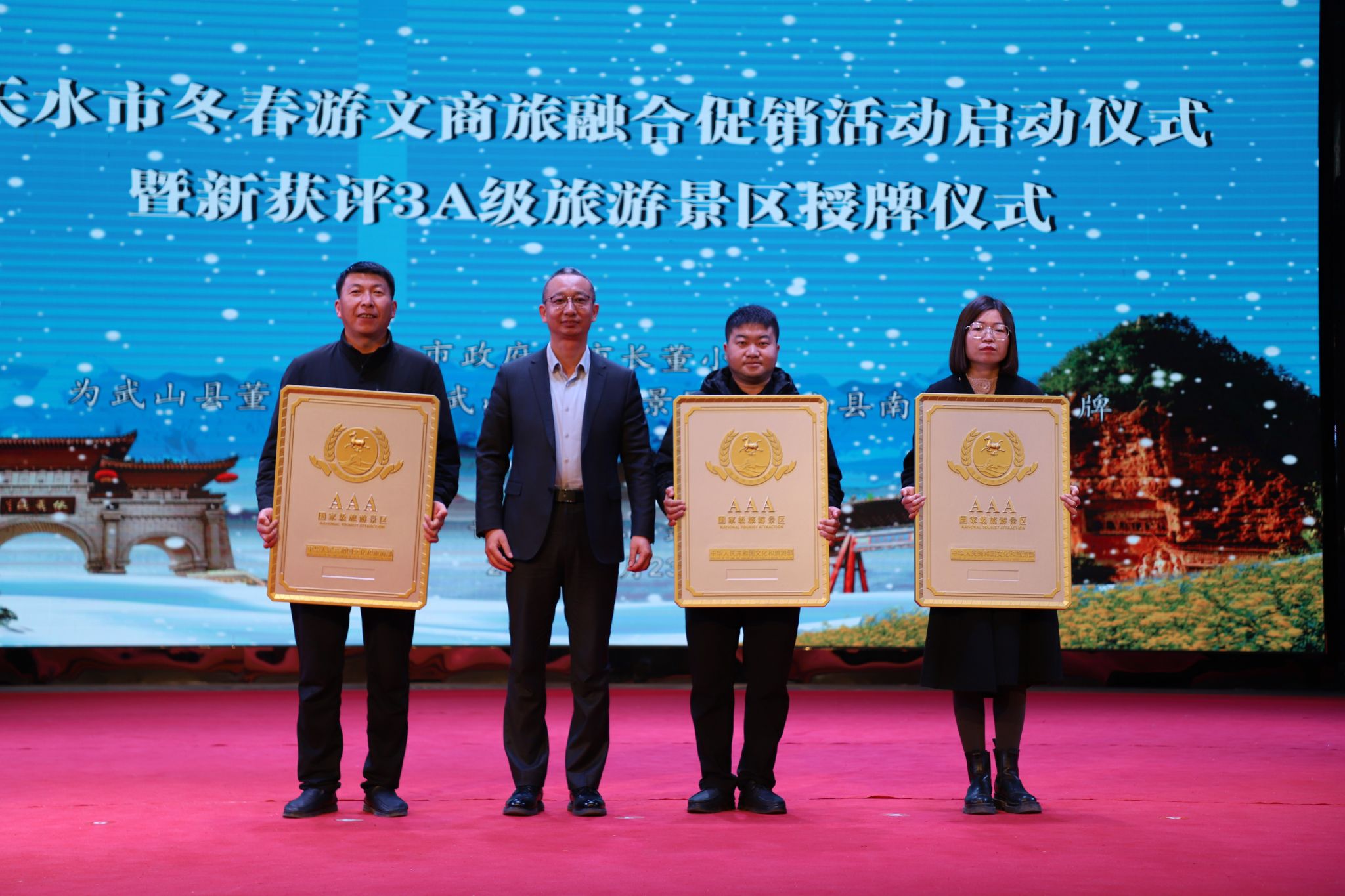 2023年11月23日,天水市冬春游文商旅融合促销活动启动仪式暨新获评3A级旅游景区授牌仪式在武山县文体中心礼堂隆重举行,全市被授牌的七家新评3A级景区中武山县有3家荣列其中,分别是武山县董庄景区、武山县马年景区、武山县南坪景区,为武山旅游事业添上浓墨重彩的一笔。