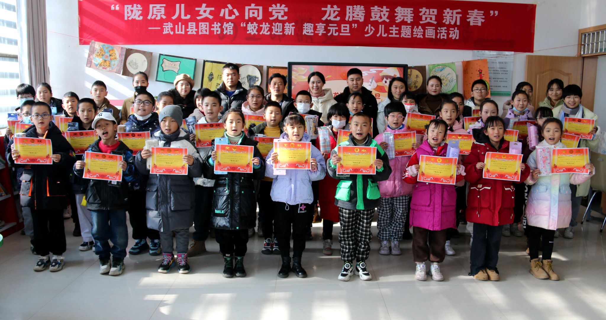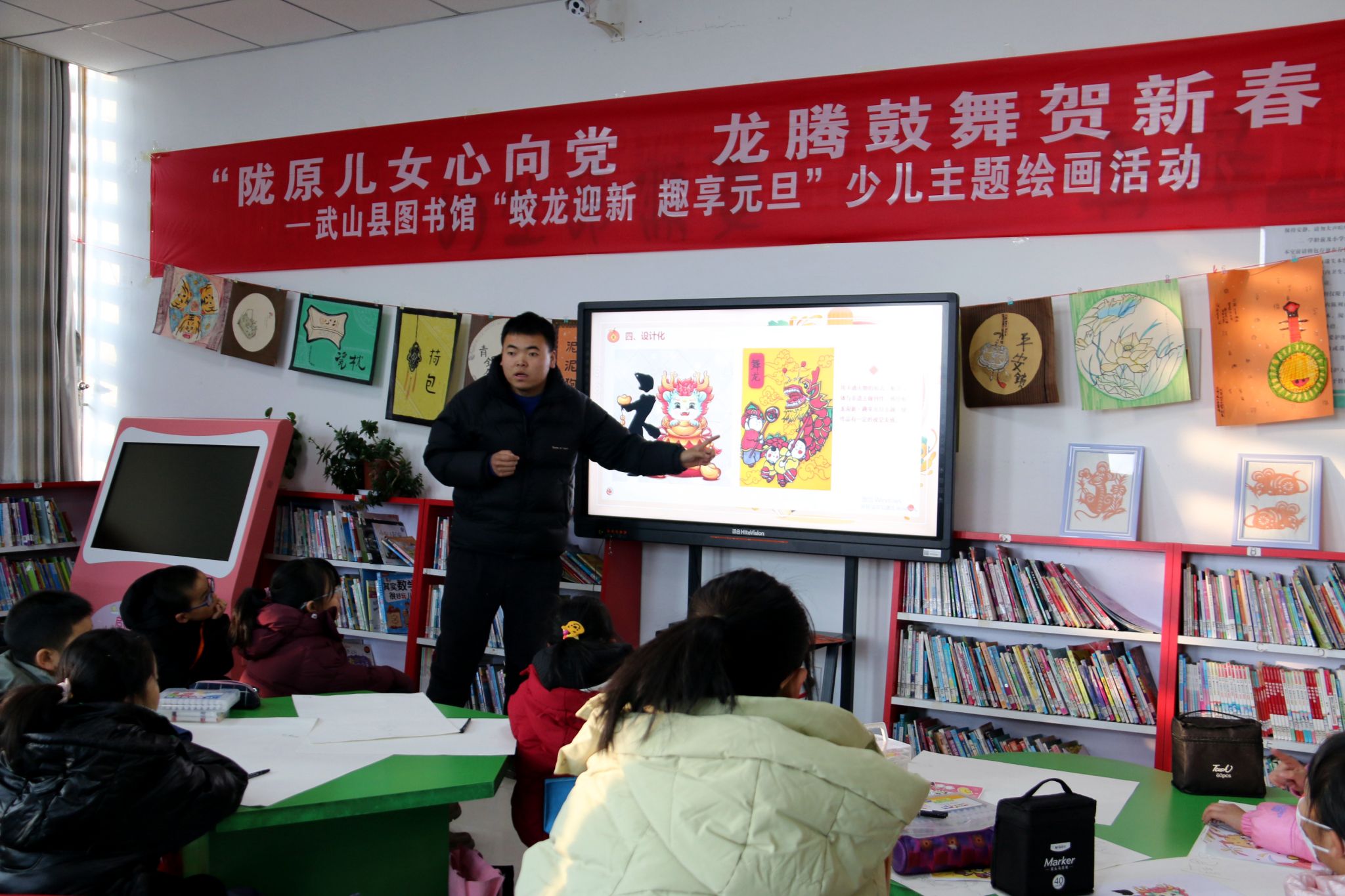 创意绘画,“龙”重登场。在2024甲辰龙年即将来临之际,为深入贯彻落实党的二十大精神,大力弘扬和传承中华优秀传统文化,丰富广大少年儿童精神文化生活,营造浓郁的节日氛围,提高少年儿童的艺术素养和阅读兴趣,12月23日,武山县图书馆热烈举办了“蛟龙迎新 趣享元旦”少儿主题绘画及作品展示活动,活动吸引了36名少年儿童绘画爱好者的踊跃参与,他们踏着新年的节拍,手持斑斓画笔,让新年别有一番“画”说。