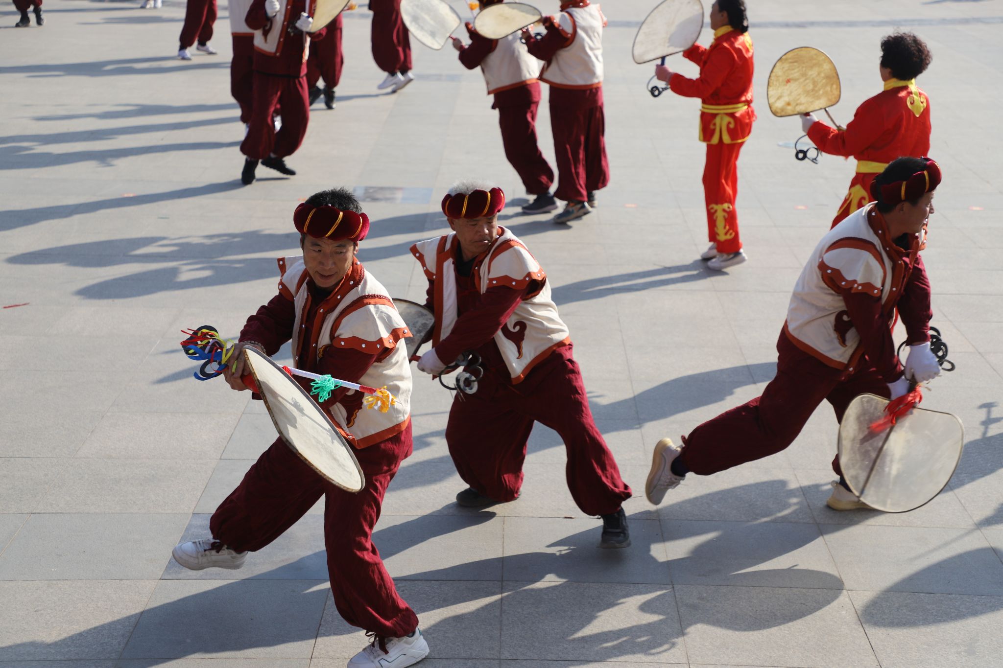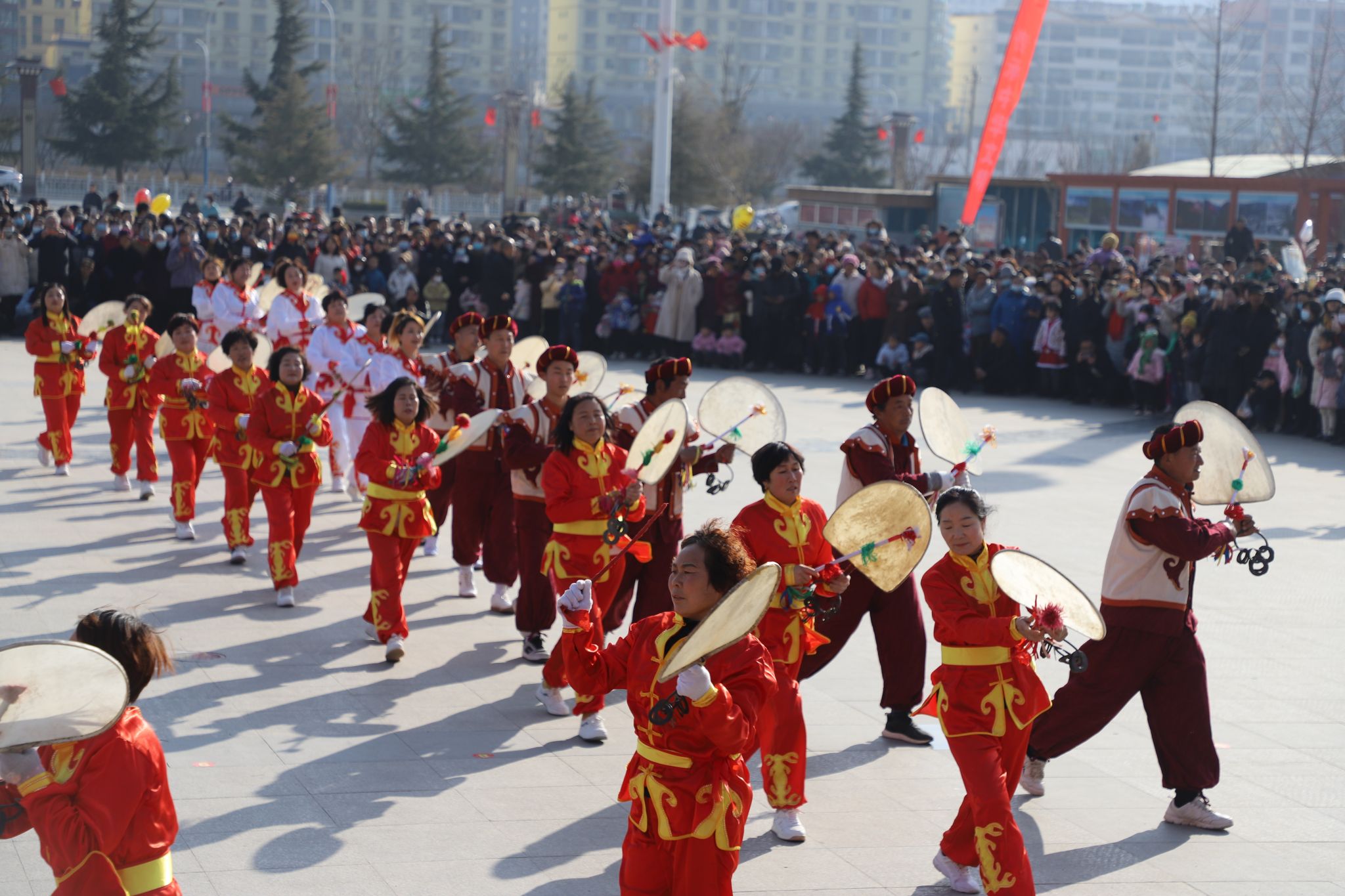 冬阳明媚辞旧岁,鼓舞渭川展新姿。武山县人民广场暖阳融融,人潮涌动,彩旗猎猎,鼓声欢腾,来自滩歌、龙台、洛门、城关四镇的五支旋鼓队,以庞大的阵容,多变的队形,突出的地域特色,鲜明的风格特点,为参加“两会”的代表、委员和广大群众献上了一台国家级非遗武山旋鼓舞的精彩演出,玉龙出水、白马分鬃、珍珠倒卷帘、凤凰三点头等传统旋法,一一展示,经典纷呈,精彩不断。