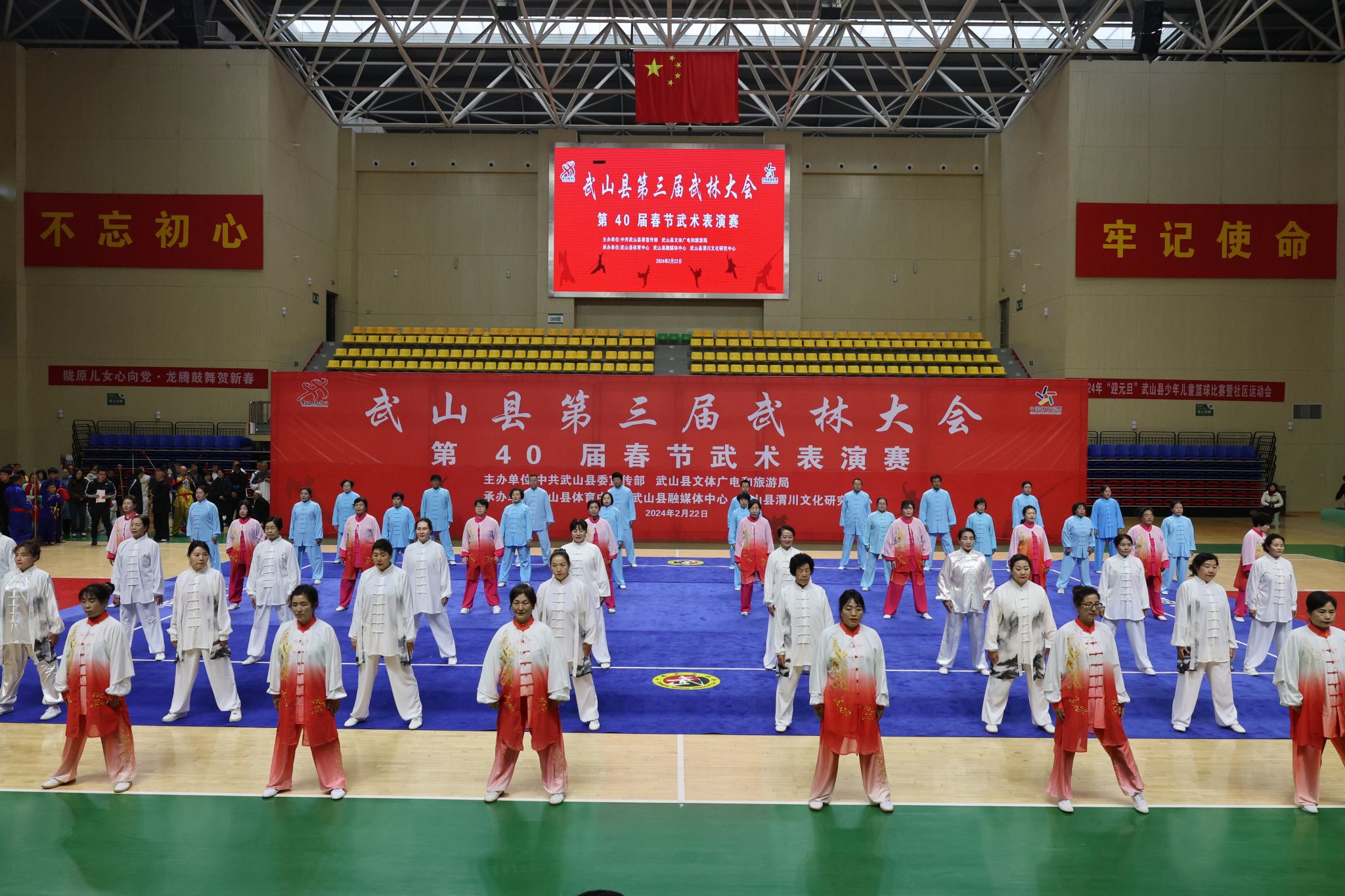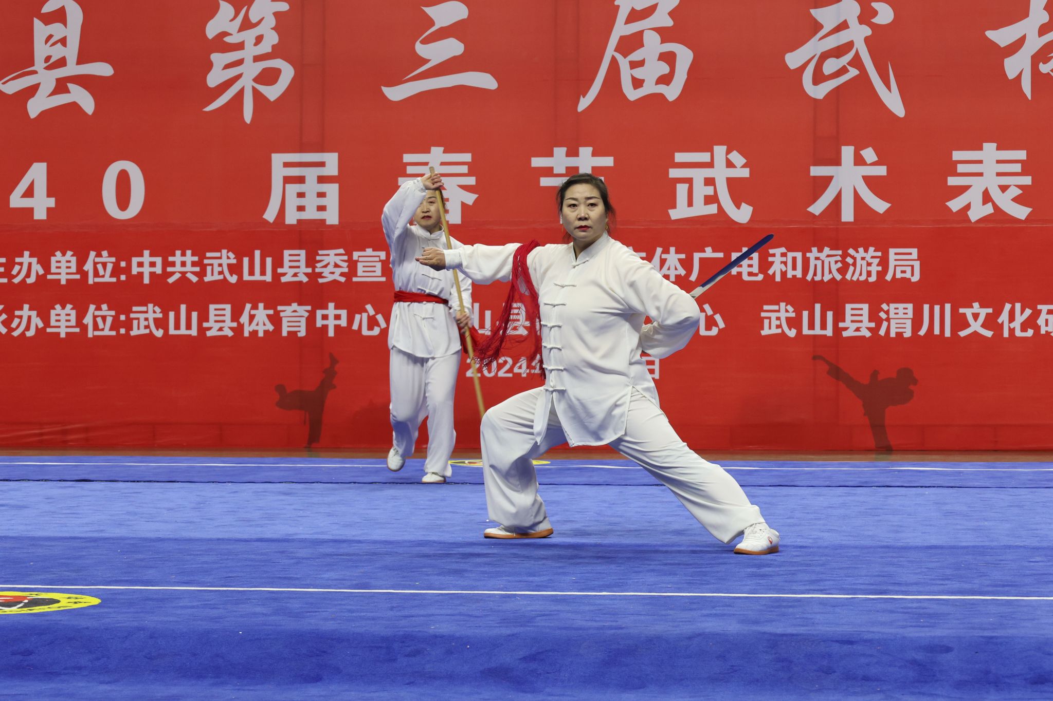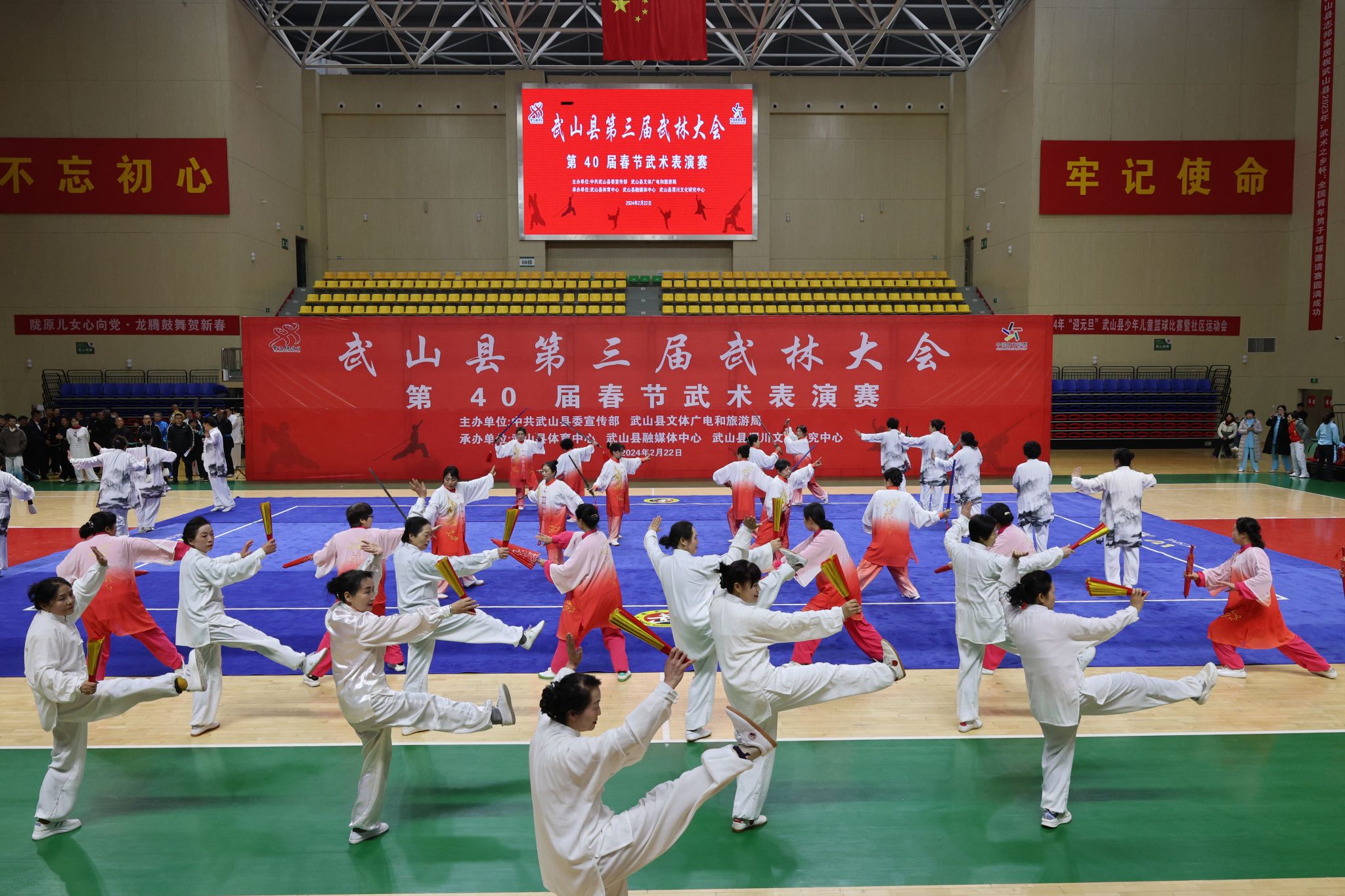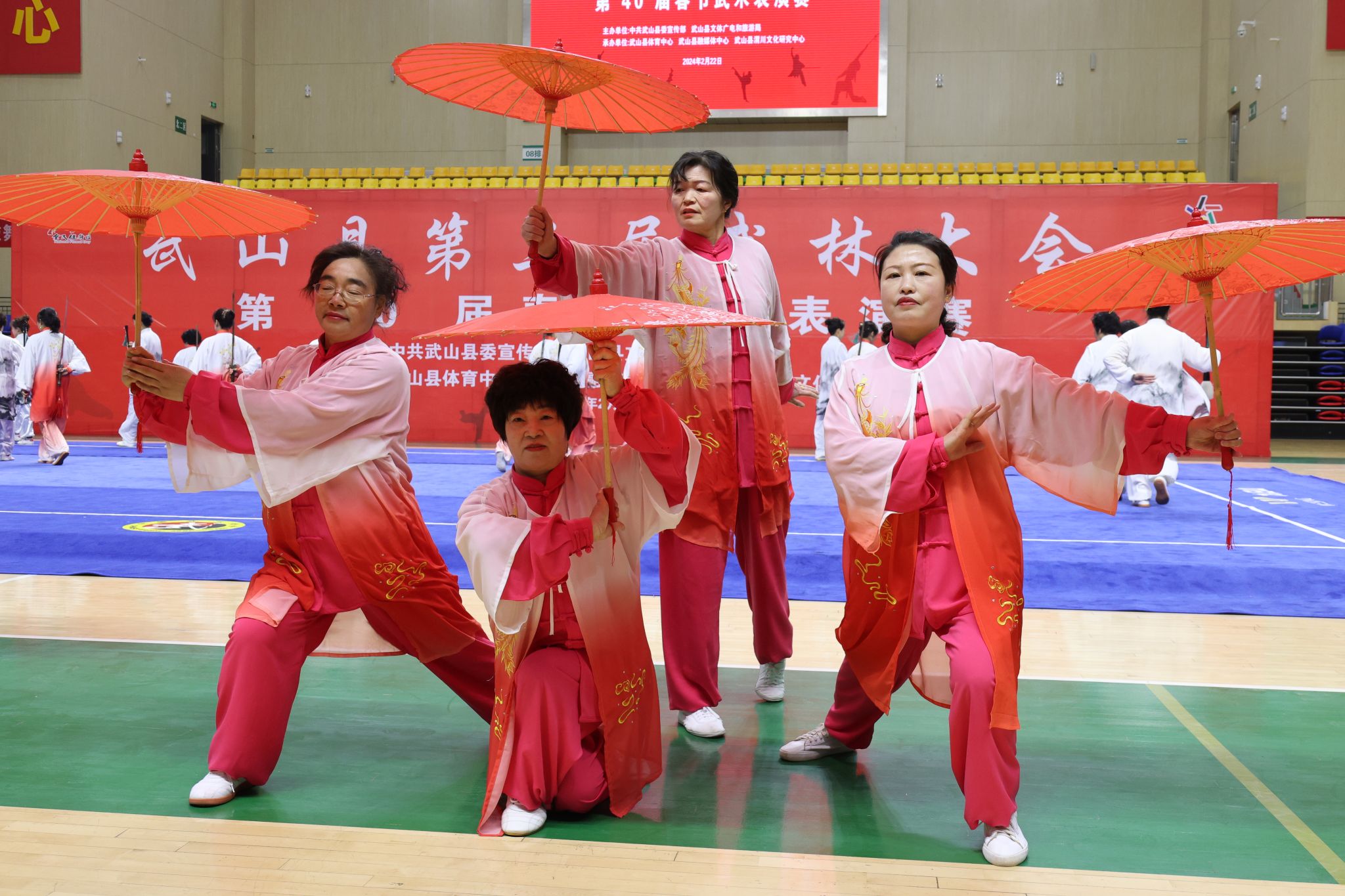 武山是西北第一个全国武术之乡,具有春节耍秧歌演武术的传统。为巩固和光大“全国武术之乡”荣誉,武山县连续举办了春节武术表演赛40届。2024年2月20日,武山县第三届武林大会春节武术表演赛隆重举行,在29支代表队尤其是21场集体项目中,武山县文化馆馆办艺术团队巾帼武术队以大气的表演脱颖而出,为全县太极拳展演开辟了新的路子,成为太极拳比赛的一个亮点。