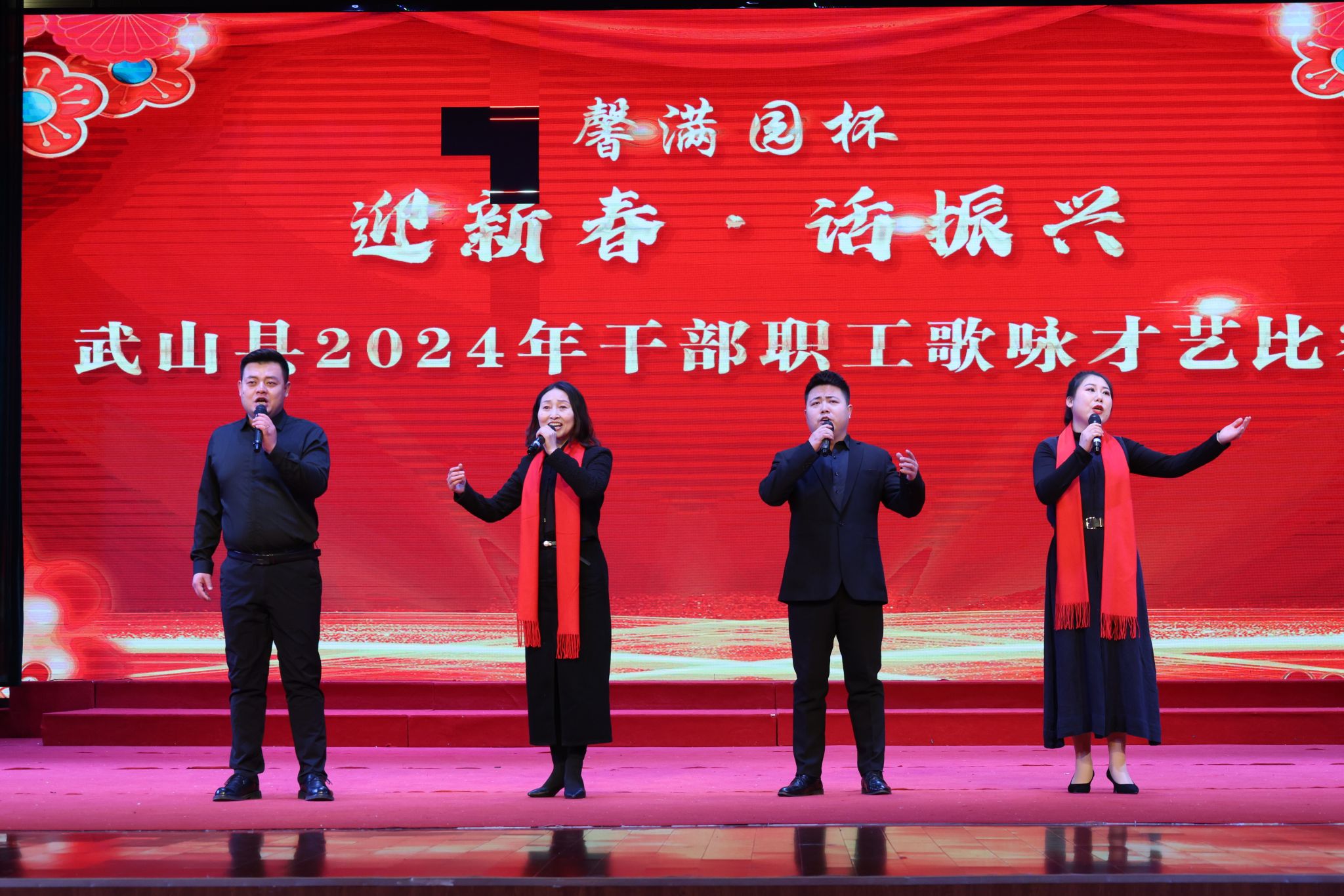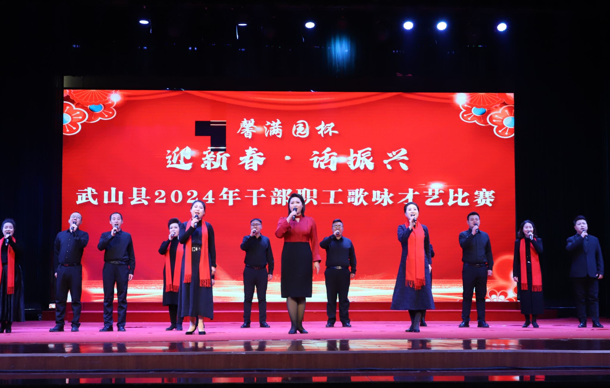 雪舞渭川兆祥瑞,歌颂祖国庆佳节。2月23上午,武山县文体中心大礼堂歌声悠扬,激情澎湃,参加馨满园杯“迎新春 话振兴”武山县2024年干部职工歌咏才艺比赛总决赛的选手们,满怀豪情,进行才艺比拚。县四大组织领导、干部职工代表、群众等600多人参加了赛事活动