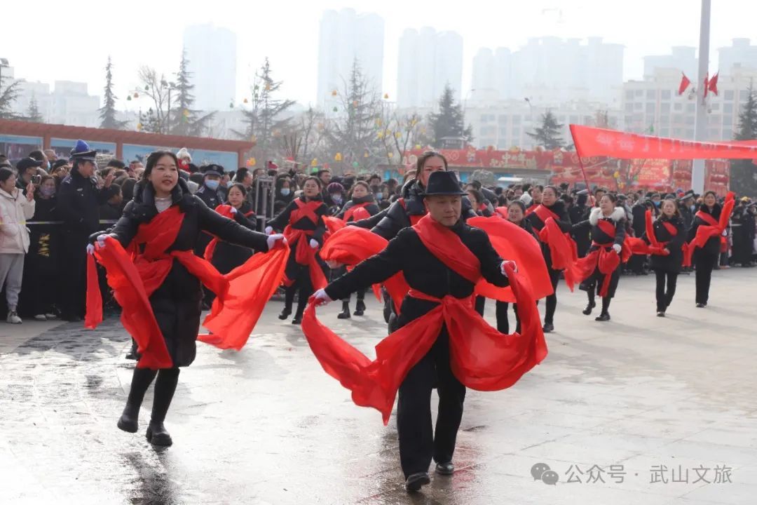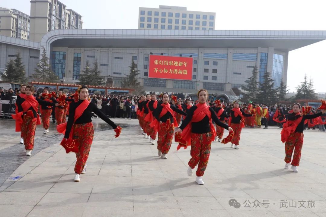 亮点不断,精彩纷呈,也让龙年的年味更浓,各乡镇秧歌特色突出,滩歌的马排子、高跷、捣蒜罐,四门的三国文化马排子,鸳鸯的红色文化方阵,城关的舞龙舞狮和艺术团队扭扭队,洛门的扭扭队把传统秧歌和现代文化元素相结合,“因杯而名的山丹镇”以“玉润山丹 十有武山”为主题,还装出了周庄西瓜演出组。尤其滩歌的《捣蒜罐》二百多人的方阵,霸气登场,让全场气氛再次活跃到巅峰。捣蒜罐从八仙之一的张国老捣药炼丹演化而来,寓意健康长寿、清吉平安。张果《题登真洞》有诗一首:“修成金骨炼归真,洞锁遗踪不计春。野草谩随青岭秀,闲花长对白云新。风摇翠筱敲寒玉,水激丹砂走素鳞。自是神仙多变异,肯教踪迹掩红尘。”红色油彩象征日子红红火火,并与观众互动,趁其不备,把短棍上的油彩涂到脸上,大家同乐,共享喜气。国家级非遗武山旋鼓舞、巾帼武术队的腰鼓《开门大吉》《鼓舞天地》等表演使秧歌汇演高潮迭起。