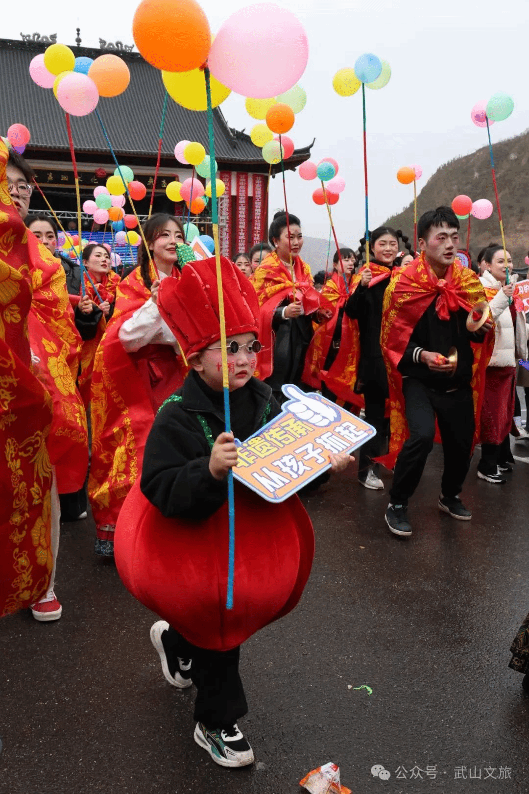 转模式,守正创新。捣蒜罐以前是白天秧歌中几个人的小角色,一句“倒骑毛驴捣蒜罐”就说清了表演模式,其寓意美好,在功能上有殿后护卫的作用,护卫秧歌的方式就涂彩。改革开放之初,没有油彩就把蒜和墨汁拌匀来涂。后来生产方式转变,生活水平提高,就不骑驴了,用上了色红方便的油彩。2024年春节,第一次大胆展出二百多人的捣蒜罐队,而且一炮打红,并火爆天水麻辣烫“吃货节”,今天又火爆武山水帘洞景区。