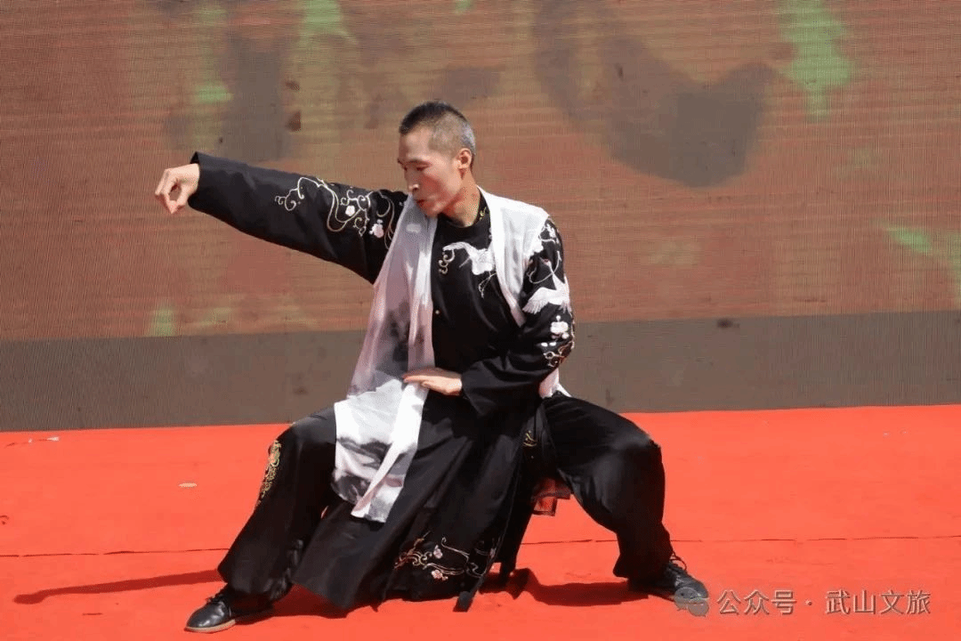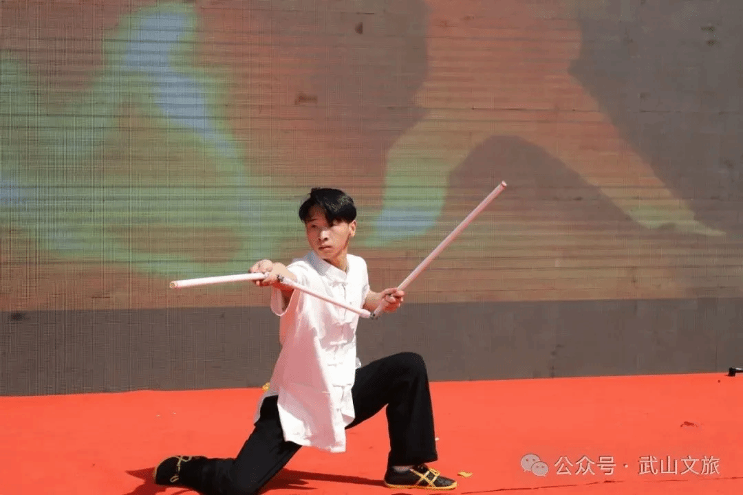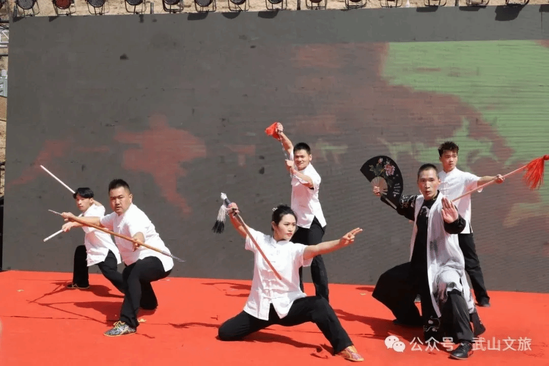 天水三国文化厚重,诸葛亮智收姜维,木门道计杀张郃等故事家喻户晓。武山有庞德故里、三国古战场遗址铁笼山等文化遗址,民间还有三国武术研究会。为彰显三国文化,武山武术展演以庞德双手带开场,姜维黄龙带把枪收尾。中间有刀、枪、剑、棍、穗子等精彩展演。“文有太极安天下,武有八极定乾坤”。郭艳春展演的太极拳让观众大开眼界,甚至有太极行家一招一式、一手一脚现场点评,高度赞扬。武术展演展示了武山人民的精气神,激发了场内武术爱好者的激情和热情。展演结束后,六个表演者和观众进行互动,开展了现场传武活动。