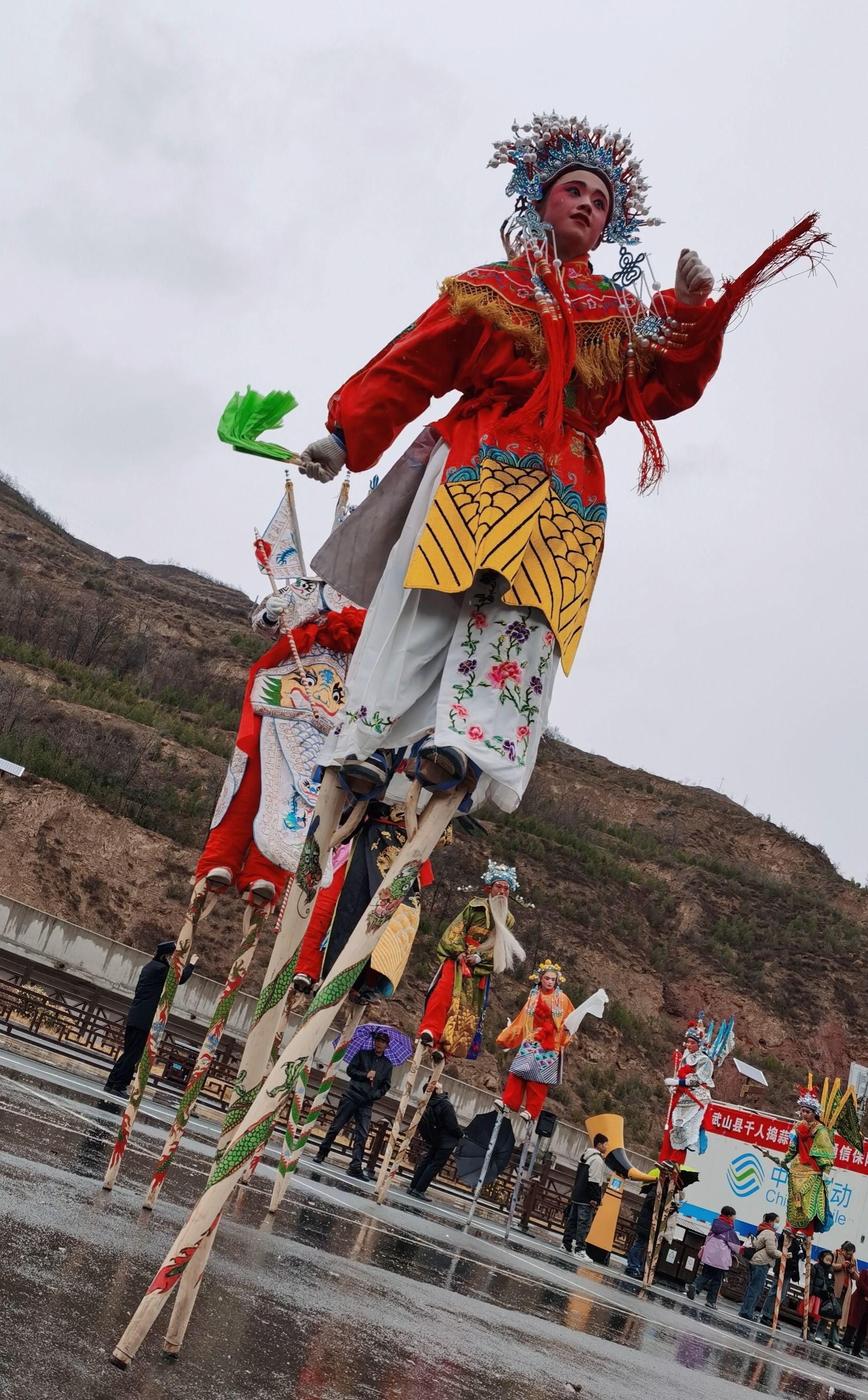 演出现场,高跷队员们踩着高跷,身着传统戏服,装扮成传统戏曲人物,在铿锵有力的锣鼓声中穿插前行,展示着各种绝活。队员们身姿轻快、步伐稳健,赢得在场观众的阵阵掌声。