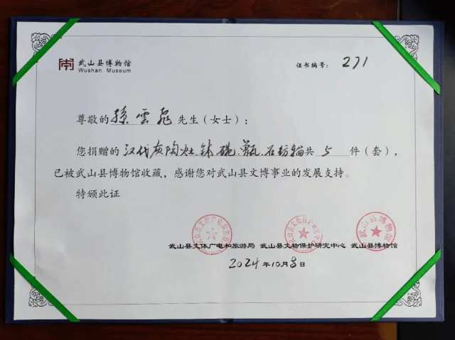 为了感谢他对博物馆事业的支持和贡献,武山县博物馆为其颁发了捐赠赠书,并赠送《武山县博物馆馆藏精品文物图册》一本。