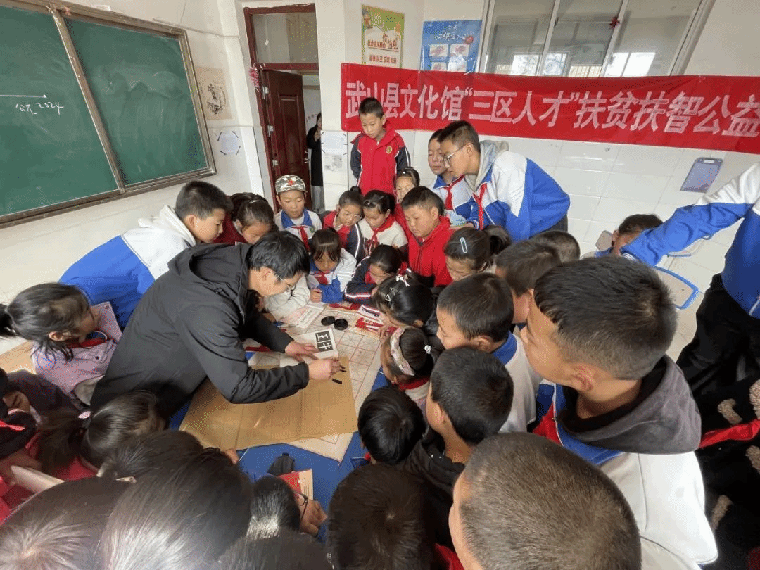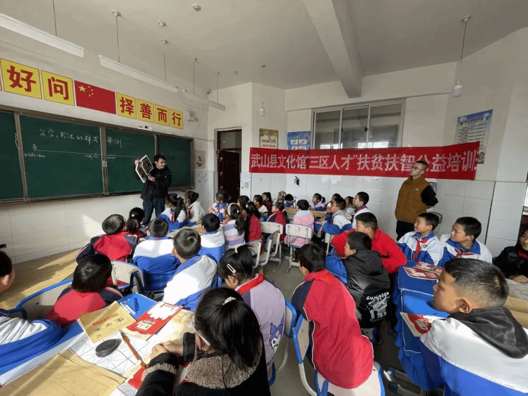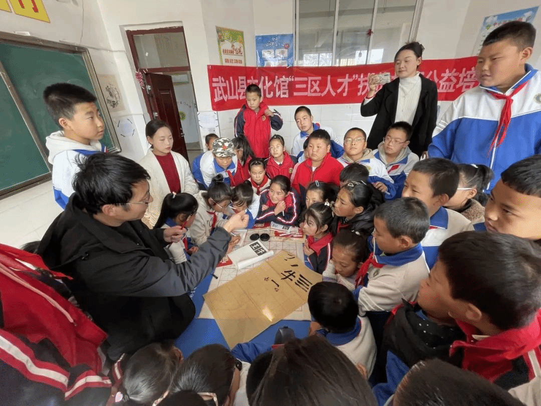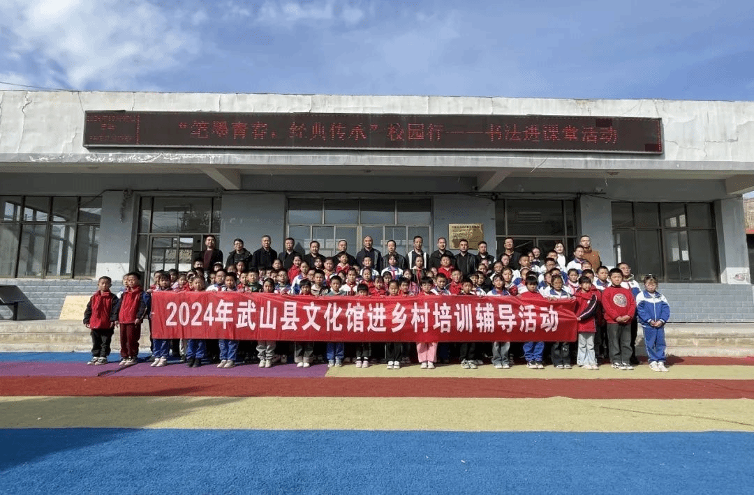 11月6日,武山县文化馆组织馆内书法专业文化志愿者,走进鸳鸯镇丁家门小学开展文化惠民新时代文明实践“笔墨青春•经典传承”校园行——书法进课堂活动,以促进传承和弘扬中华民族优秀传统文化,提高师生审美情趣,培养学生了解书法字体的演变、感悟各种书体的审美内涵。