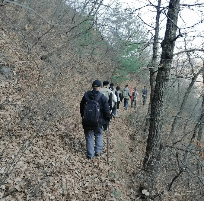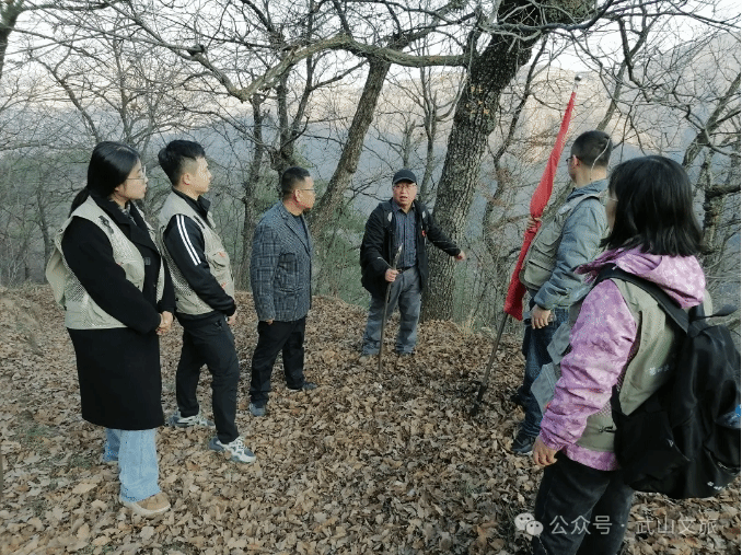 普查车到达老君山山底下,需要大家徒步上山,一下车张耀德同志的双眼闪烁着激动的光芒,仿佛看到了往日文物保护的点点滴滴,他滔滔不绝地向我们讲述着这座山峰的沧桑往事,激发我们对文物遗迹的热爱之情。登山的道路蜿蜒曲折,陡峭险峻,密林丛生的树枝阻隔前行,飘落的树叶在地面铺成厚厚的地毯,虽然好看但令人脚步难稳,时有滑倒之忧,每一步都需要小心翼翼。普查队员们互相搀扶,手握粗壮的“树枝”作为拐杖,气喘吁吁艰难前行,偶有人跌倒,却惹的一阵阵爽朗的笑声,欢欣鼓舞间,忘却了疼痛和疲惫。令人倾佩的是,年过六旬的张耀德同志爬起山来却丝毫不输周围的年轻人们,矍铄如昔,展现出了超乎寻常的体力和勇气,让人备受鼓舞。由于距离上一次文物普查已经过去了16年,“三普”登记表中记载的文物点周边风貌都有了不小的变化,增加了辨认的难度,张耀德同志回忆当时“三普”场景,以及对环境的熟悉,指引我们顺利找到文物点。