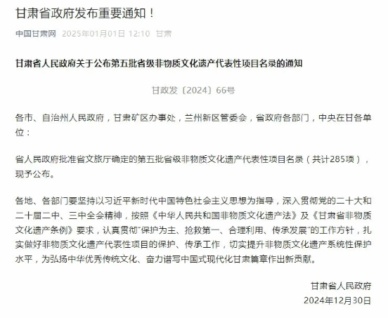 2024年12月30日,甘肃省人民政府公布了第五批省级非物质文化遗产代表性项目名录(共285项),武山县入选5项,分别是武山秧歌、武山水帘洞庙会、武山马社火、武山春秋大刀、姜维黄龙带把枪。截至目前,我县共有省级非遗代表性项目11项。
