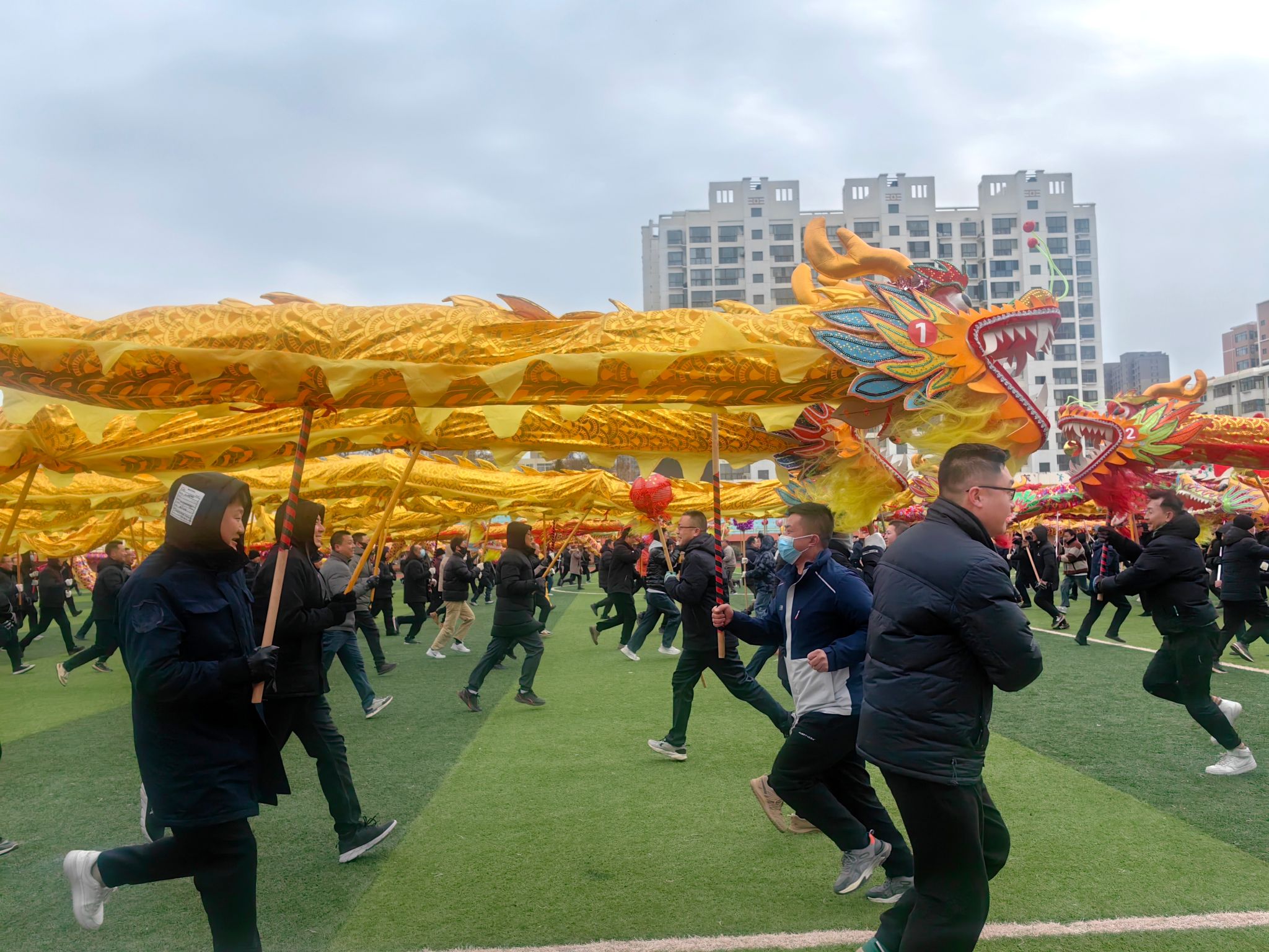 排练场上,伴随着震天的锣鼓声,红、黄、绿三条彩龙腾空飞舞,蜿蜒曲折的龙身时而腾跃、时而流动、时而盘起、时而穿花,舞龙队员们个个士气高昂、精神抖擞,卖力地挥舞、快速地奔跑、敏捷地穿梭,将彩龙耍得威威生风。尽管天气非常寒冷,但是参演队员们个个热情高涨、精神抖擞、神采飞扬,每个人脸上都洋溢着灿烂的笑容……大家认真排练,力争在春节期间为大家献上精彩纷呈的文化盛宴。