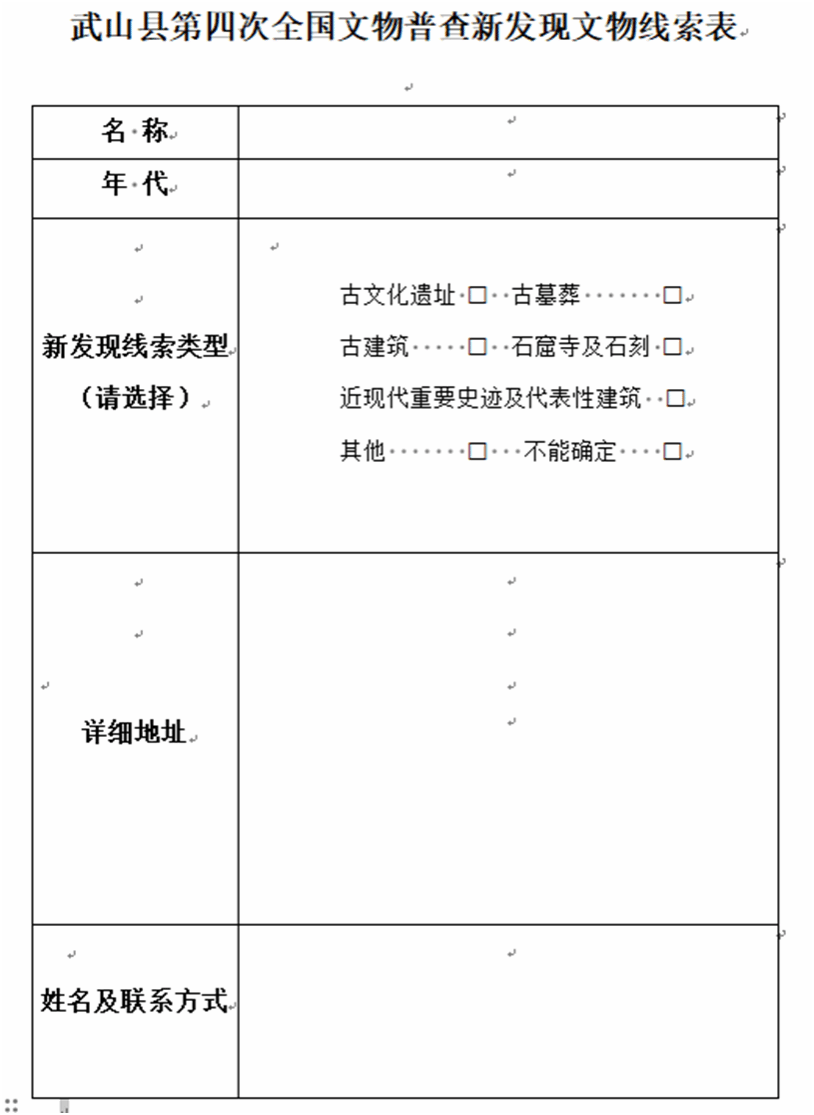 线索征集要求:为了确保信息的准确性和可靠性,请您在提供线索时按照《武山县第四次全国文物普查新发现文物线索表》要求,提供尽可能详细的情况描述,包括名称、年代、详细地址等。