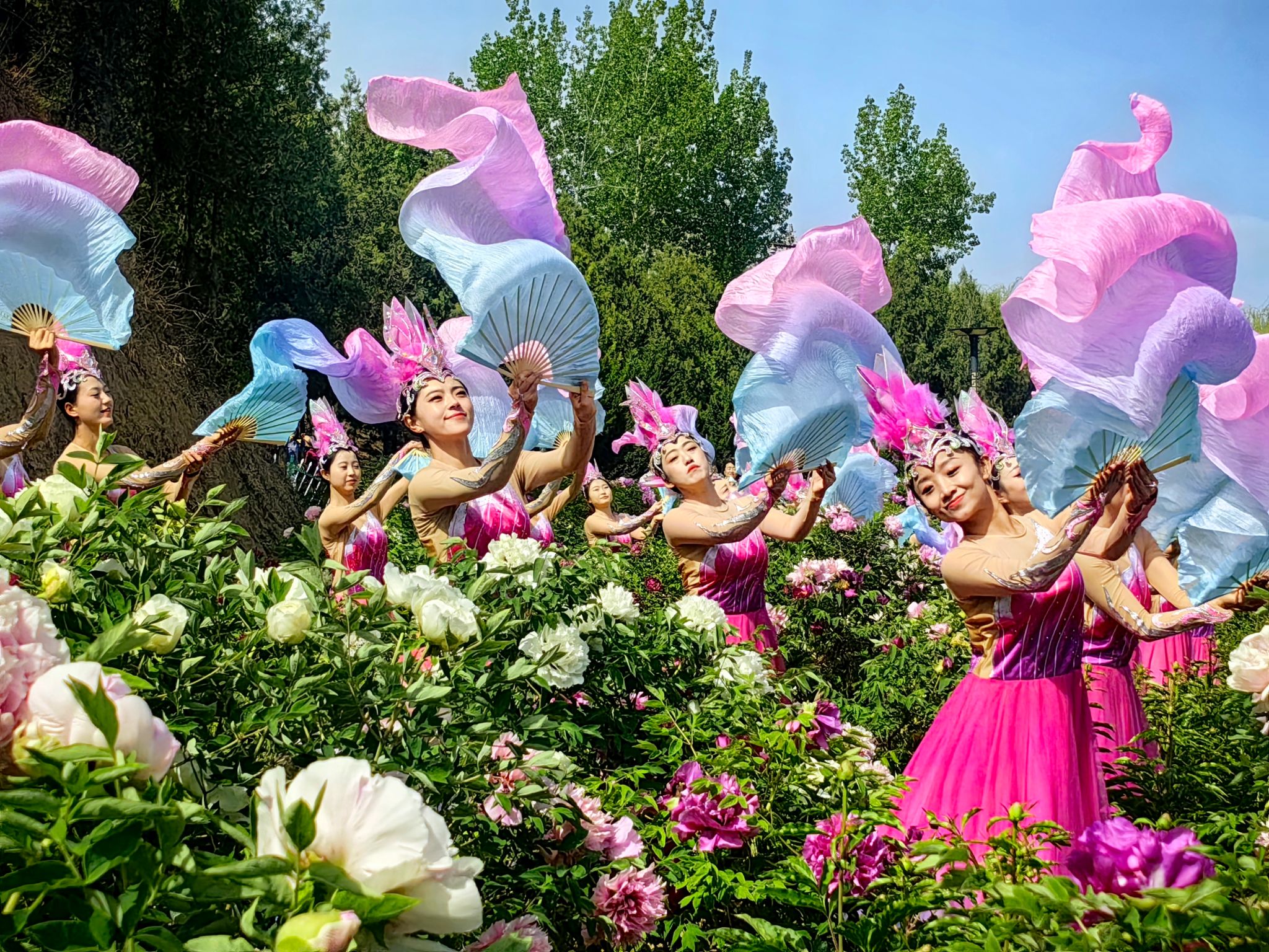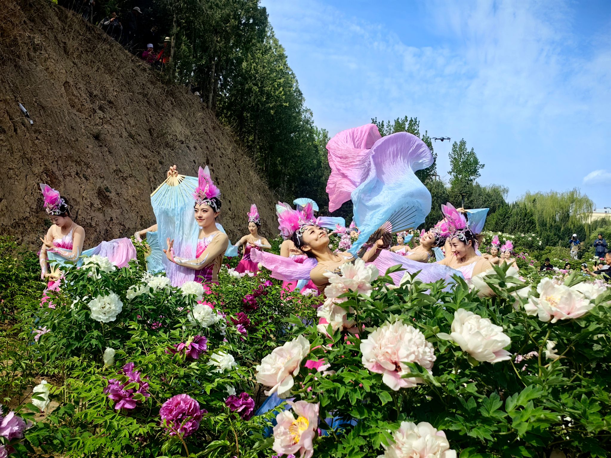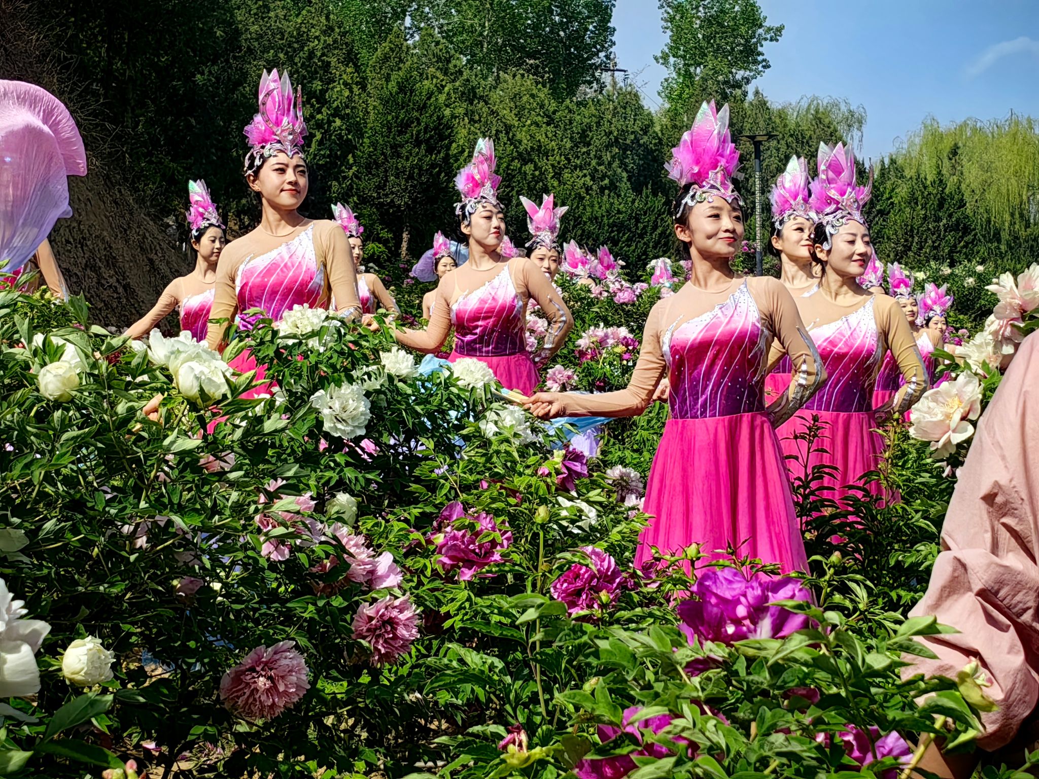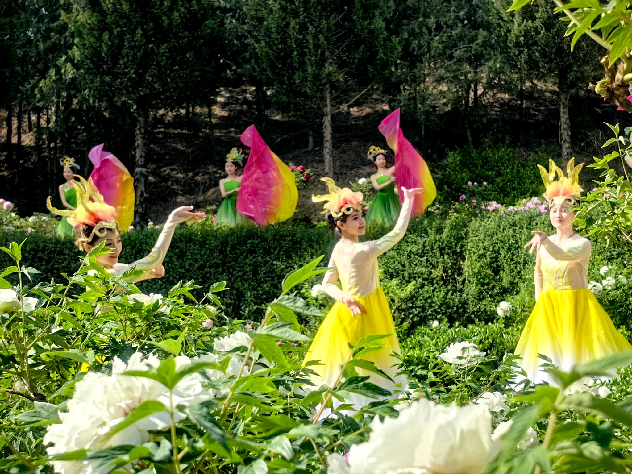 上午九时,天水市歌舞艺术研究中心的40人演出团队以《花开盛世》迎宾舞拉开序幕,演员们身着霓裳,在牡丹丛中翩跹起舞,宛若穿越时空的盛世画卷。古典舞《国色天香》和牡丹园姹紫嫣红的景色相得益彰。最令人惊艳的当属"牡丹仙子"巡游,二十几位身着花仙装扮的少女手持花扇穿行于花径之间,情景舞蹈《飞将军李广》生动再现秦州深厚的文化历史。园中设置的NPC快闪打卡点前,身着将士服装的表演者与游客拍照打卡,天水市动物园特别带来的小猴子等萌宠,也吸引不少游人流连驻足。