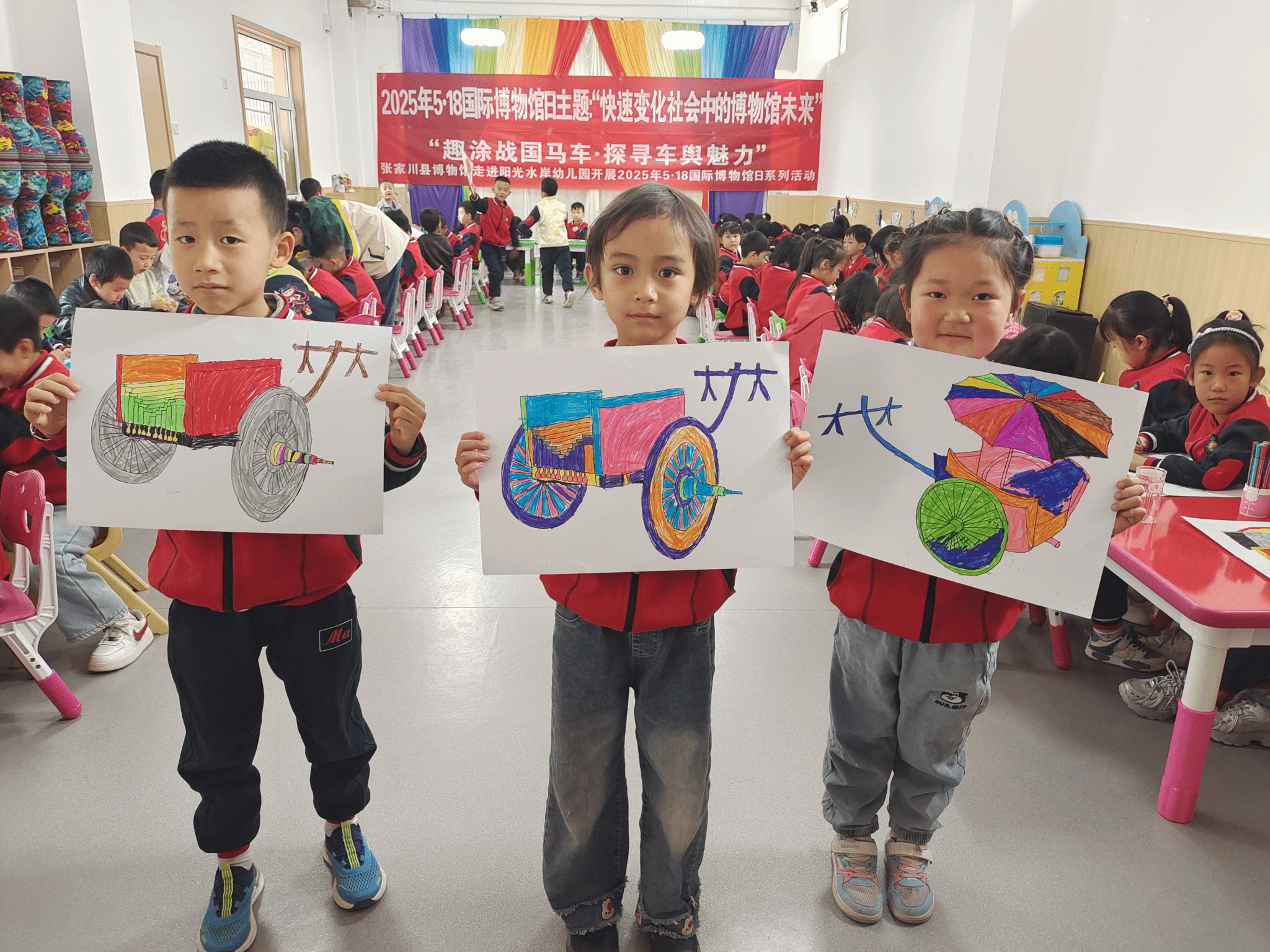 到了涂色创作环节,讲解员先进行简单示范,详细讲解涂色的注意事项,孩子们迫不及待地化身“小小艺术家”,充分发挥想象力,为战国马车涂上绚丽多彩的颜色,有的将马车涂成梦幻的彩虹色,有的用金色和红色展现马车的华贵,博物馆工作人员和幼儿园教师全程巡回指导,不断鼓励孩子们大胆用色、自由创作,对每一个独特的创意都给予充分肯定,现场氛围热烈而温馨。孩子们自豪地展示自己的作品,相互交流创作思路和心得,一幅幅色彩斑斓的画作,不仅是孩子们想象力与创造力的结晶,更是他们对战国马车文化的独特理解与表达。