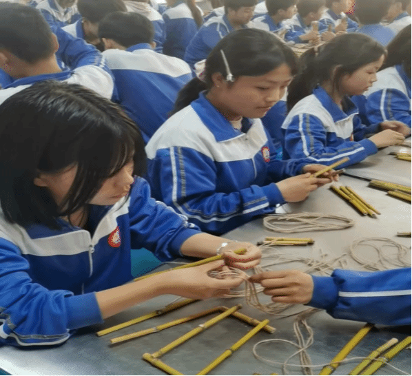 活动现场,滨海新区博物馆的专业老师首先通过视频生动有趣的为学生们详细讲解演示了古竹筏的制作步骤,包括竹子的选材、切割、绑扎等关键技巧。县博物馆老师现场指导,学生们分组合作,亲自动手实践。尽管过程中遇到了一些困难,如竹子的绑扎不够牢固等,但在老师和同学们的共同努力下,一个个精巧的古竹筏模型逐渐成型。学生们看着自己亲手制作的作品,脸上洋溢着自豪的笑容。