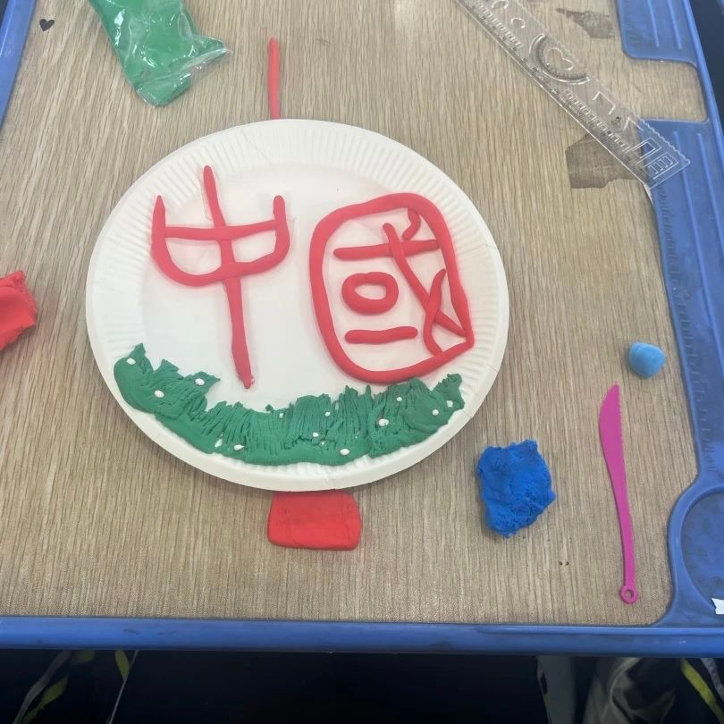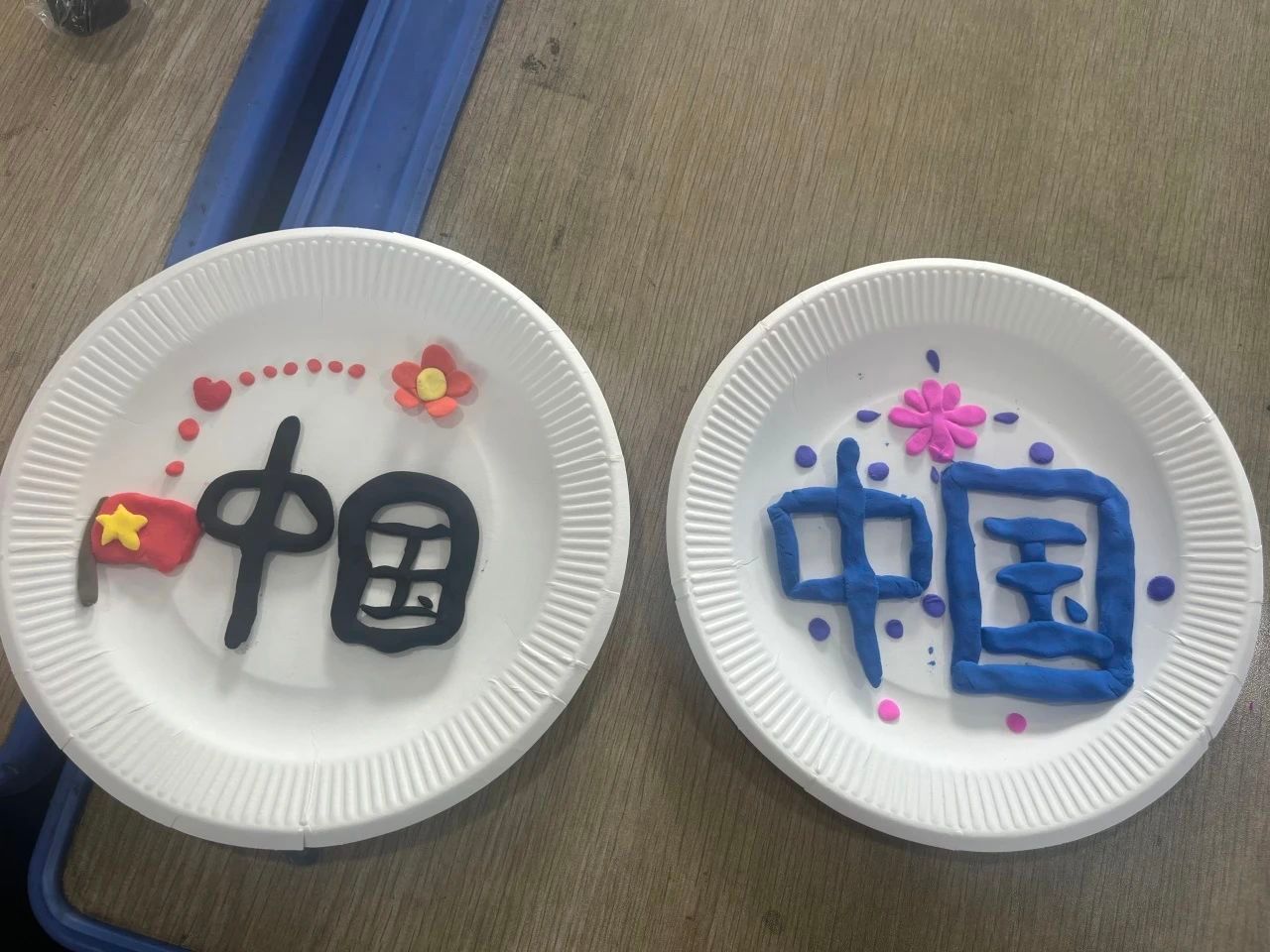 在动手实践环节,孩子们迎来了充满趣味与挑战的黏土制作 “中国” 卡片活动。他们充分发挥想象力和创造力,用五彩斑斓的黏土,将刚刚学到的汉字知识转化为精美的作品。有的孩子模仿篆书的古朴厚重,有的则展现行书的灵动飘逸。一双双巧手上下翻飞,不一会儿,一张张独具匠心的黏土 “中国” 卡片便新鲜出炉。