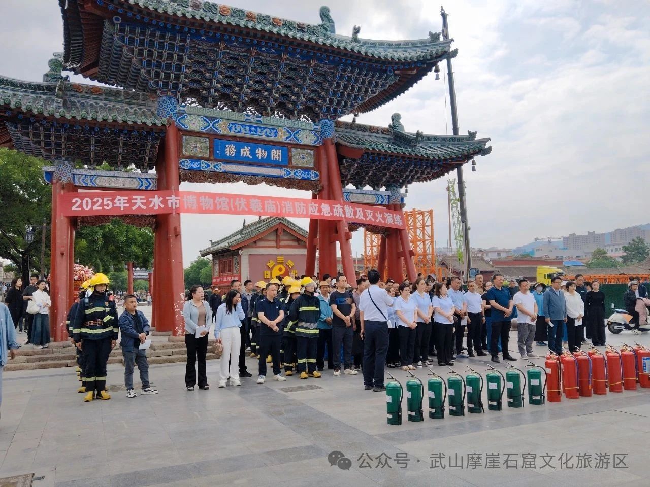 为增强武山摩崖石窟文化旅游区服务中心人员在公共场所的消防安全意识,提升应急处置能力,5月26日,武山摩崖石窟文化旅游区服务中心选派相关工作人员前往市博物馆,参加了一场意义非凡的消防应急疏散及灭火演练活动。此次演练由市博物馆精心组织策划,市消防部门专业指导,旨在提高文博场所及相关景区应对火灾等突发事件的能力。全体参训人员模拟馆内疏散演练,同时,市博物馆工作人员开展了火灾报警、应急疏散、应急救护、现场警戒等科目演练。最后参训人员在伏羲广场参加了灭火器实操演练,消防人员现场讲解演示了灭火器的使用方法及注意事项,并手把手指导参训人员使用灭火器。整个演练过程紧张有序,各个环节紧密衔接,参演人员反应迅速、操作规范。