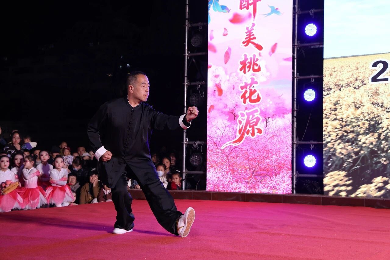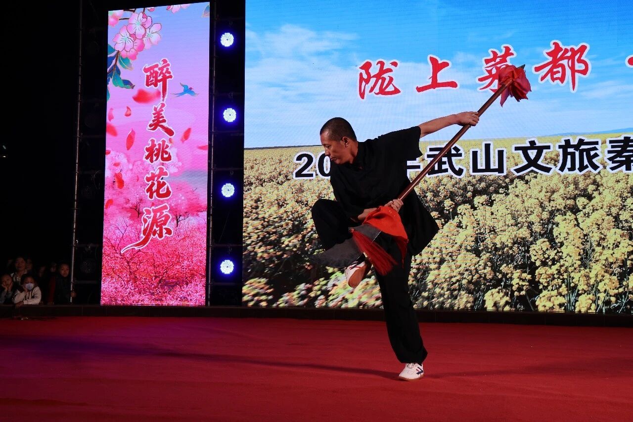 国家级非遗武山旋鼓舞铿锵的鼓声、粗犷的西部风格,顷刻燃情全场。旋鼓手生龙活虎,尽情演绎这一古老舞蹈,让传统舞蹈的精魂展现出时代的活力,独具的魅力,生生不息的精神。舞蹈在《希望的田野上》《鼓韵春风里》,用舞蹈艺术语言,深情表达了对大好河山的赞美,对美好生活的向往,生动展示了武山旋鼓舞融入骨血的独特神韵,彰显了武山人心中的诗与远方。武山是全国武术之乡,秦安是壳子棍的故乡,武山文化交流频繁。武术节目《笔墨武山》《武魂》,精彩而炫酷,太极的柔美,传统武术的刚健之美,刀剑拳棍,各具风采,给观众带来了视觉的盛宴,文化的体验,美好的向往和祝愿。文艺演出在旋律优美的《武山颂歌》中落下帷幕,全场掌声雷动,活动圆满结束。