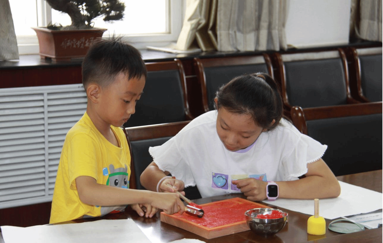 教学内容完成后,开始手工制作体验。在古籍部老师们的现场指导下,小读者们两两配合,上墨、覆纸、刷印、起纸、晾干,在一拓一印之间,将技艺变为实物作品,体验了雕版印刷中的油墨印刷环节。作品完成之后,孩子们把各自的雕版印刷作品镶嵌在画框中展示,并由古籍部老师带领参观馆藏古籍,零距离感受中华优秀传统文化的书卷之美。