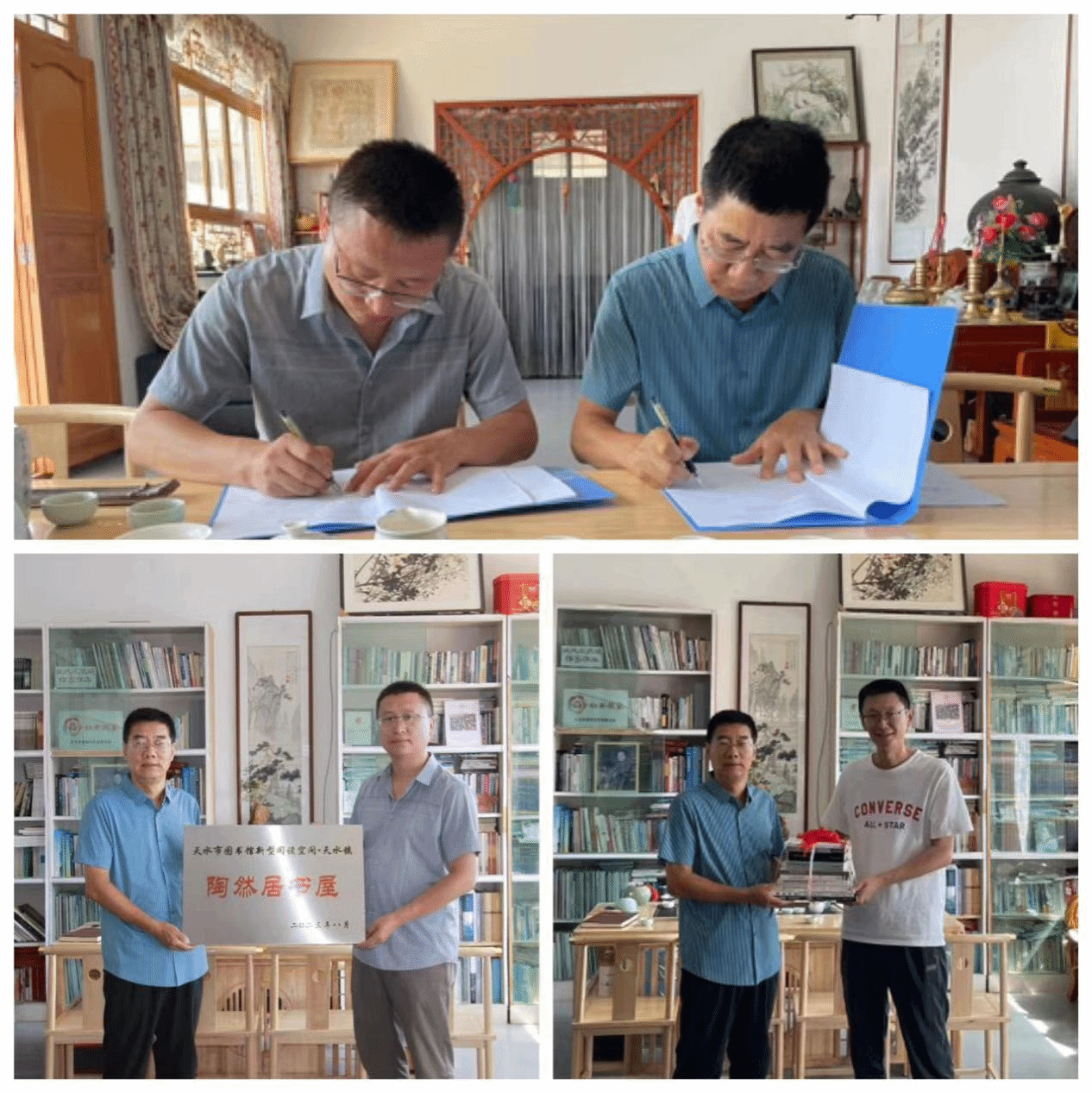 为推动农村文化建设、促进乡村文化振兴,将更多优质阅读资源和服务送到基层农村,8月21日,天水市图书馆馆长周涛、副馆长付义路等一行5人走进天水镇陶然居民俗文化陈列馆,举行“天水市图书馆新型阅读空间▪天水镇陶然居书屋”挂牌签约仪式。