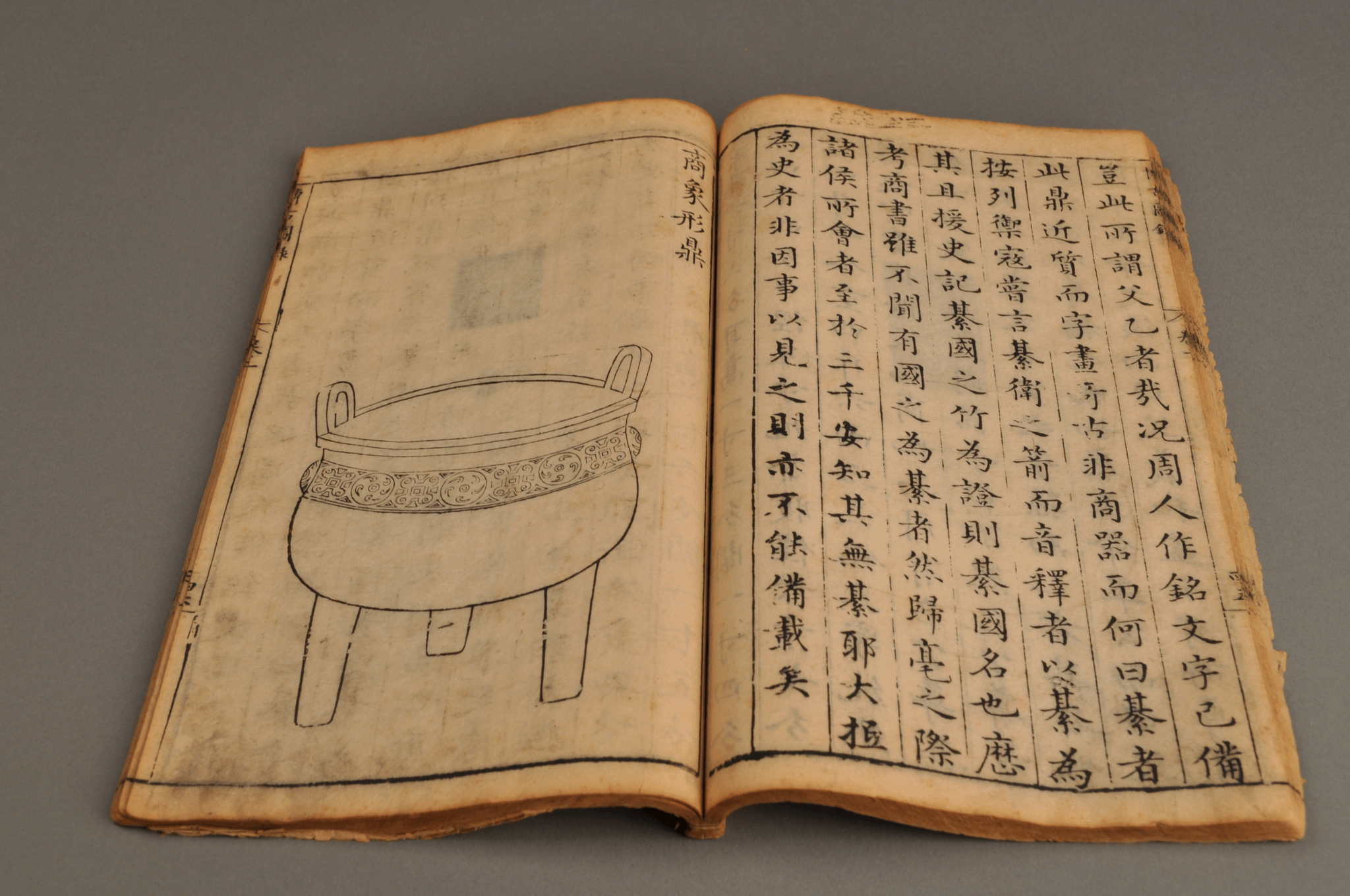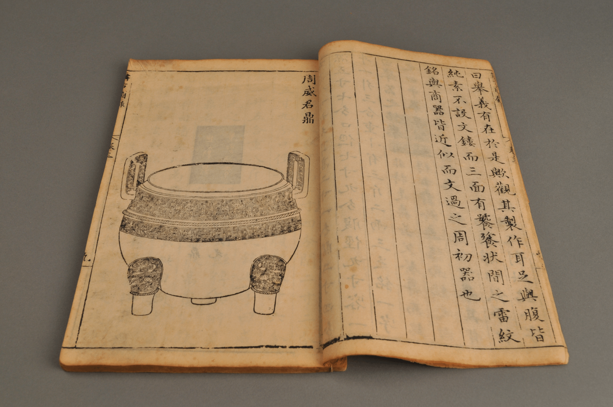 《宣和博古图》为宋代金石学著作,由宋徽宗敕撰,王黼等编纂。大观初年(1107年)开始编纂,宣和五年(1123年)之后成书。全书共三十卷,著录当时皇室在宣和殿所藏,自商至唐的古代铜器,共二十类八百三十九件。分为鼎、尊、罍、彝、舟、卣、瓶、壶、爵、觯、敦等二十类,每类器物前有总说,每件器物均摹绘图形铭文,并记录器物的尺寸、容量、重量等,勾勒铭文,兼及释文。