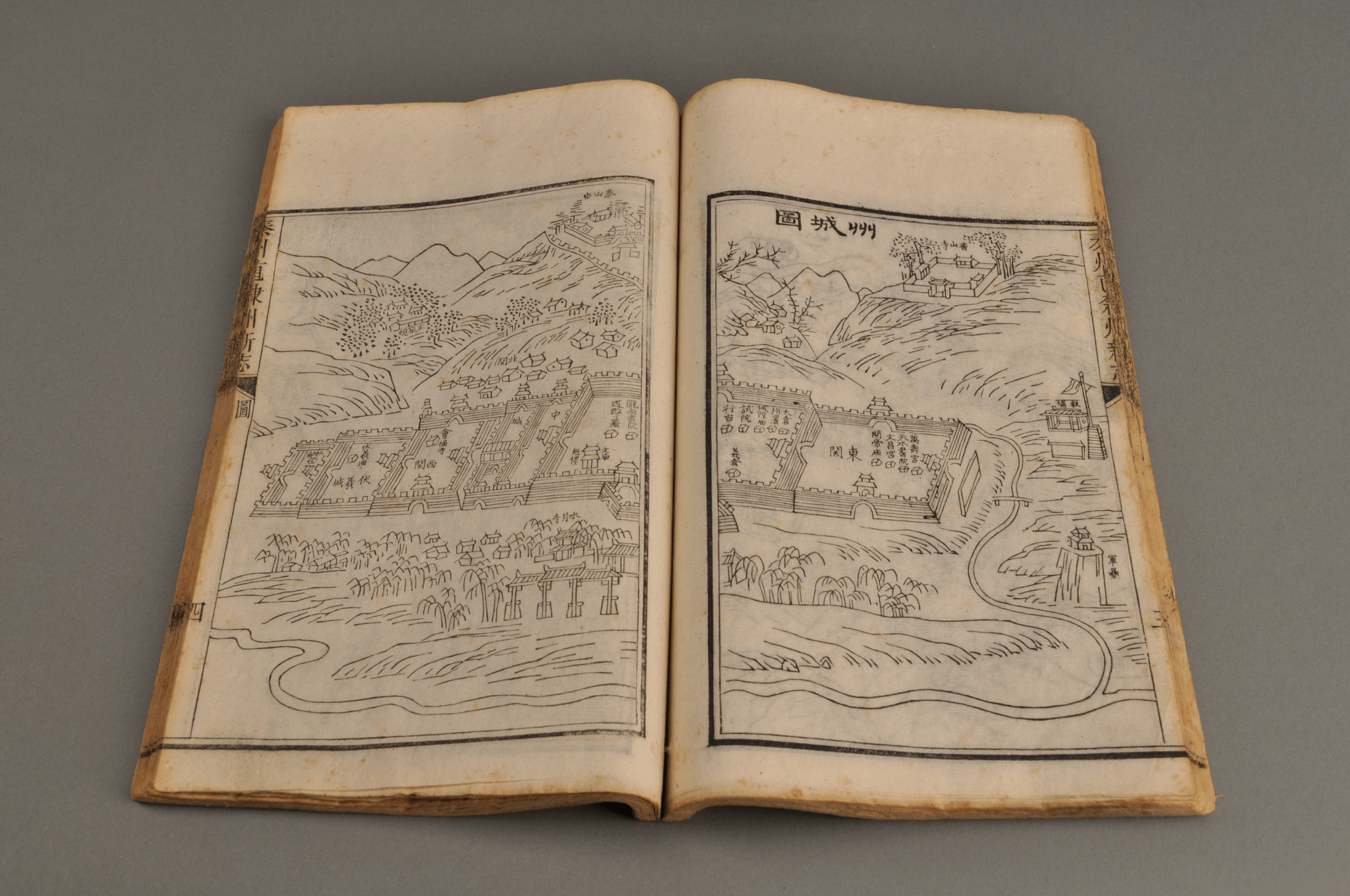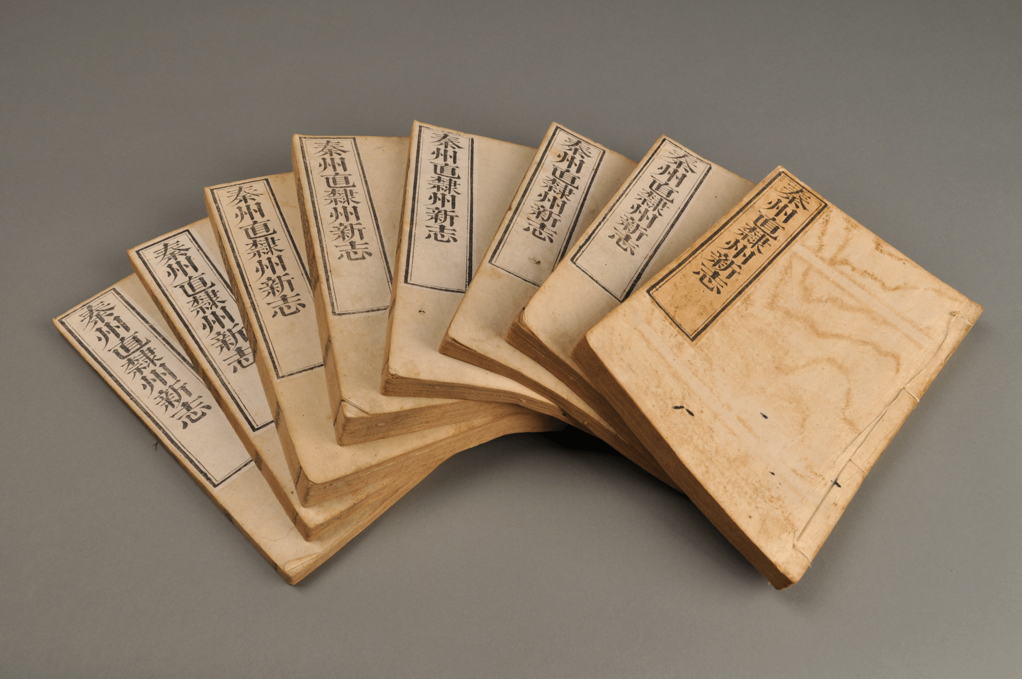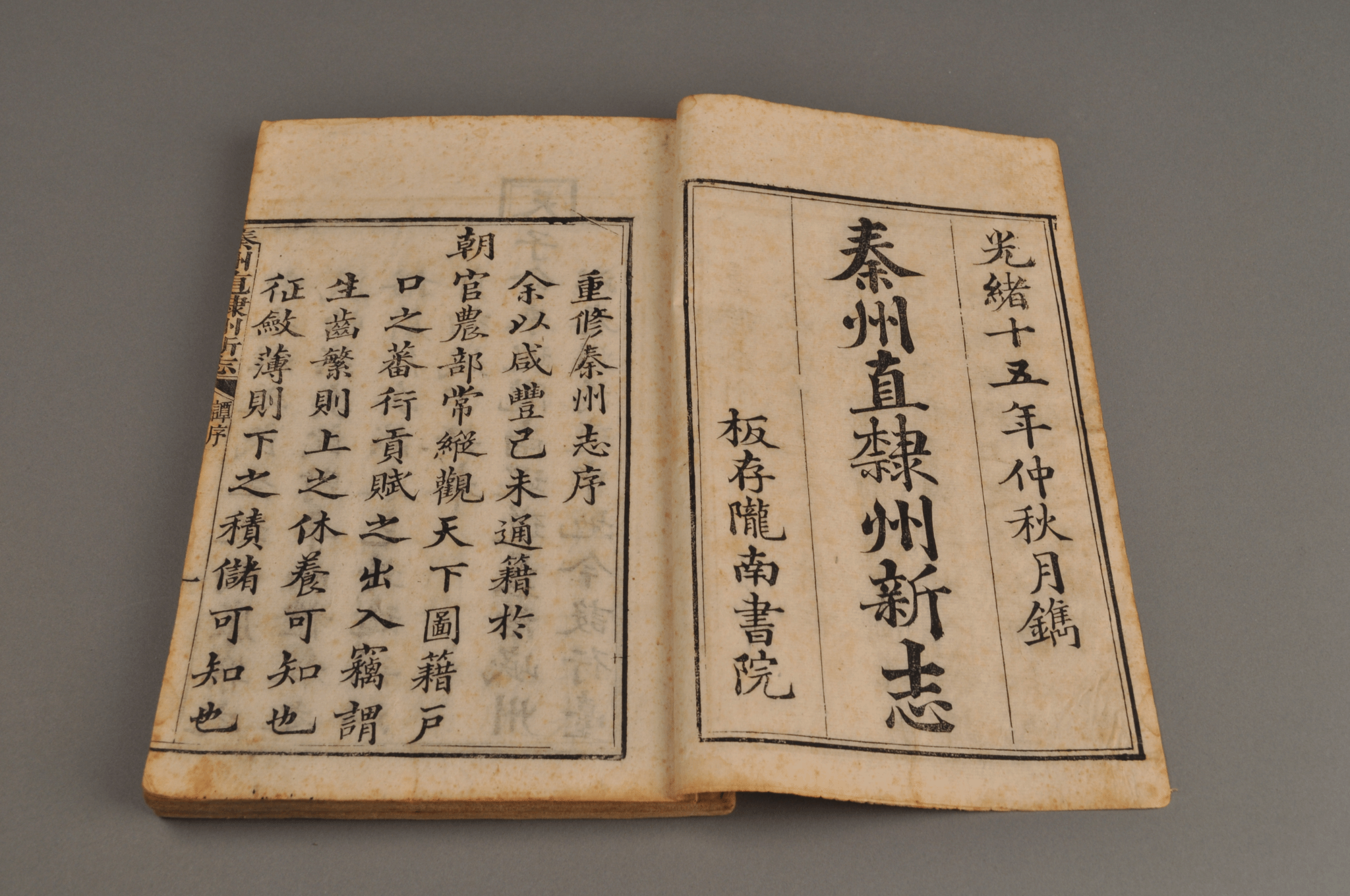 天水市博物馆藏《秦州直隶州新志》,2函16本,清光绪十五年刊刻。开本纵26厘米,横17厘米。有图有文,文字部分半页9行,满行21字,有行格,白口,左右双边,单黑鱼尾,鱼尾上注书名,鱼尾下注卷数、页码。书函木制,正中阴刻“秦州新志”,两册透雕长方形孔,用于系带。