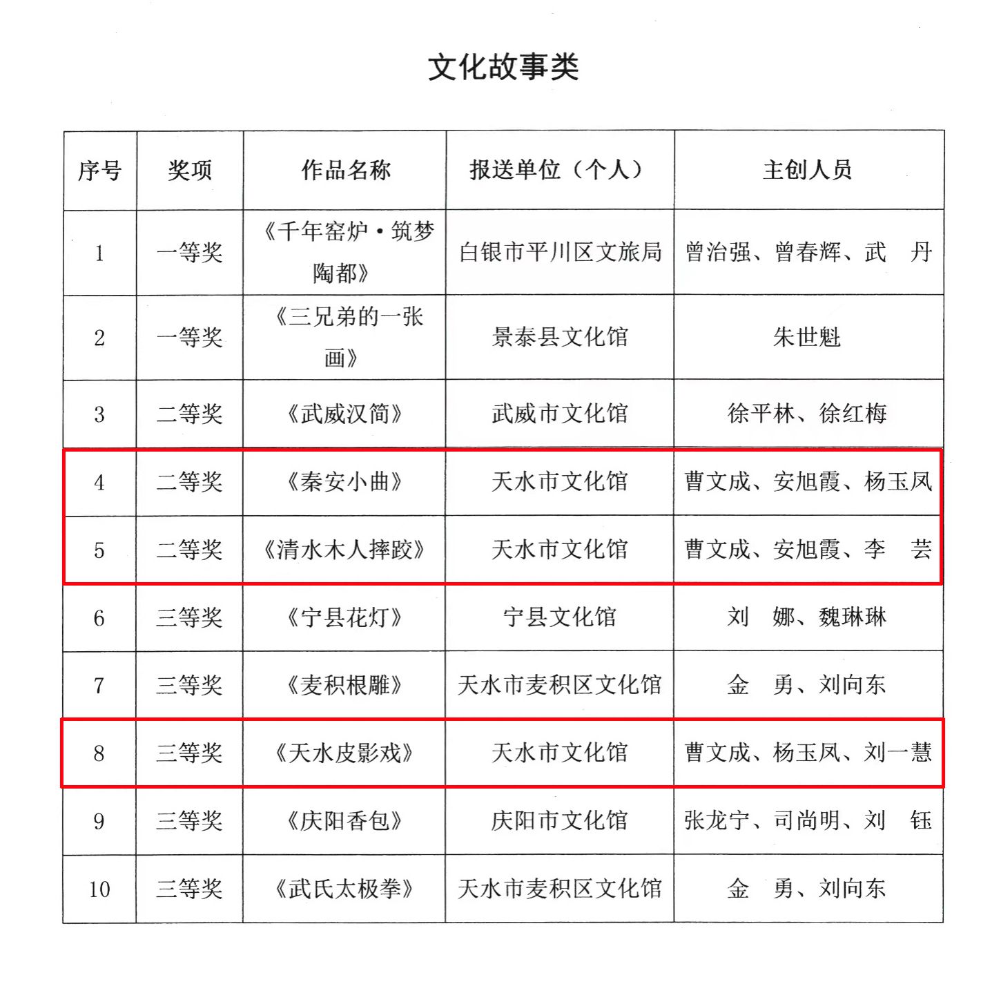 天水市文化馆组织专人精心制作了25个短视频参加展播,经过评选共有4个短视频获奖。其中,《你是逆行者,也是一束光》荣获全民阅读类二等奖,《秦安小曲》《木人摔跤》荣获文化故事类二等奖,《天水皮影戏》荣获文化故事类三等奖。