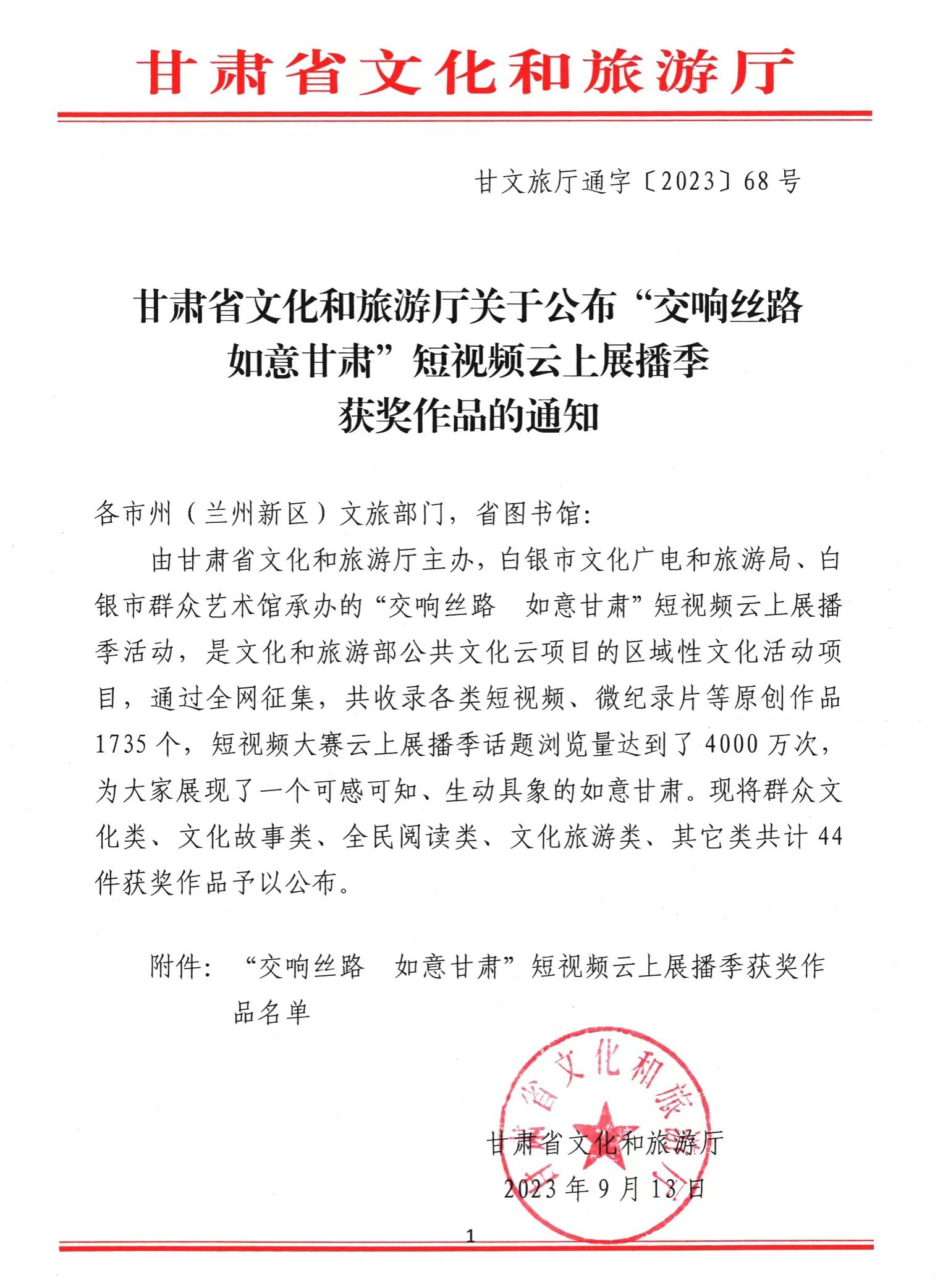 “交响丝路 如意甘肃”短视频云上展播季活动由甘肃省文化和旅游厅主办,各地州市文化和旅游局承办,是文化和旅游部公共文化云项目区域性文化活动项目,通过全网征集,共收录群众文化类、文化故事类、全民阅读类、文化旅游类各类短视频、微纪录片等原创作品1735个,其中44个作品获得不同等次的奖励。