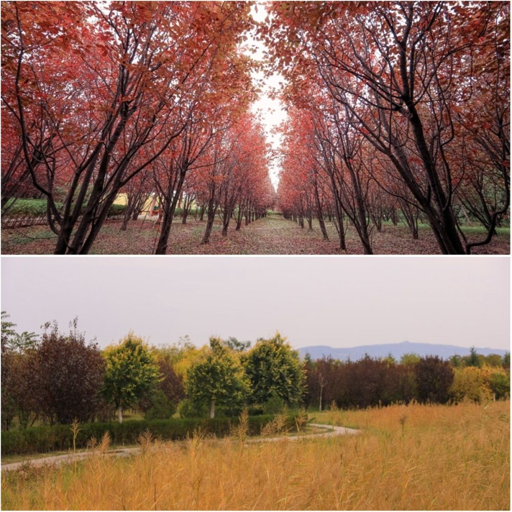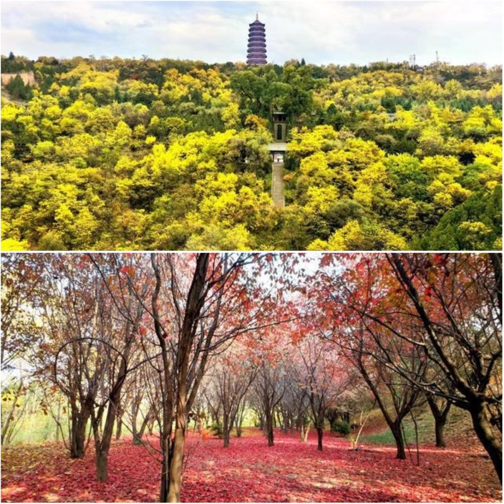 秋景之六南郭寺。秋天的南郭寺大景区,叠翠流金,蔚为壮观,蜿蜒曲折的道路两旁,各类树木色彩斑斓、美不胜收。微风吹过,金黄色的落叶像翩翩起舞的蝴蝶,为大地铺上了一张金色的地毯。