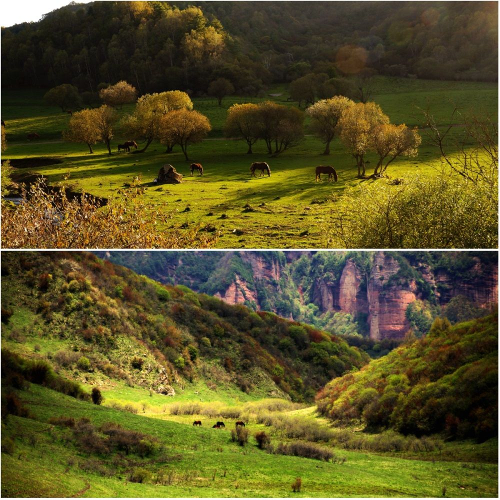 秋景之三古坡草原。秋日的古坡草原,热烈而壮美,雄奇而浪漫,大自然的鬼斧神工,将古坡点画得如人间天堂,气势磅礴的金色山峦,跌宕着款款雅姿;炽灿缤纷的瑰丽红叶,奔放着烈烈情怀。