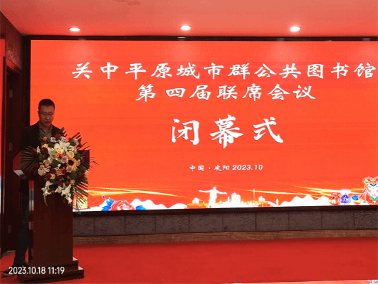下一届轮值馆西安市图书馆副馆长贾佳作表态发言后,我馆馆长周涛代表关中平原城市群公共图书馆联盟委员会做了总结发言。周涛同志对本次会议的顺利召开和闭幕表示了热烈祝贺,并勉励各联盟馆同仁要坚守“传承文明,服务社会”的初心使命,遵循习近平总书记“滋养民族心灵 培育文化自信”的发展定位,携手并进,共同开创关中平原城市群图书馆事业辉煌的新篇章。