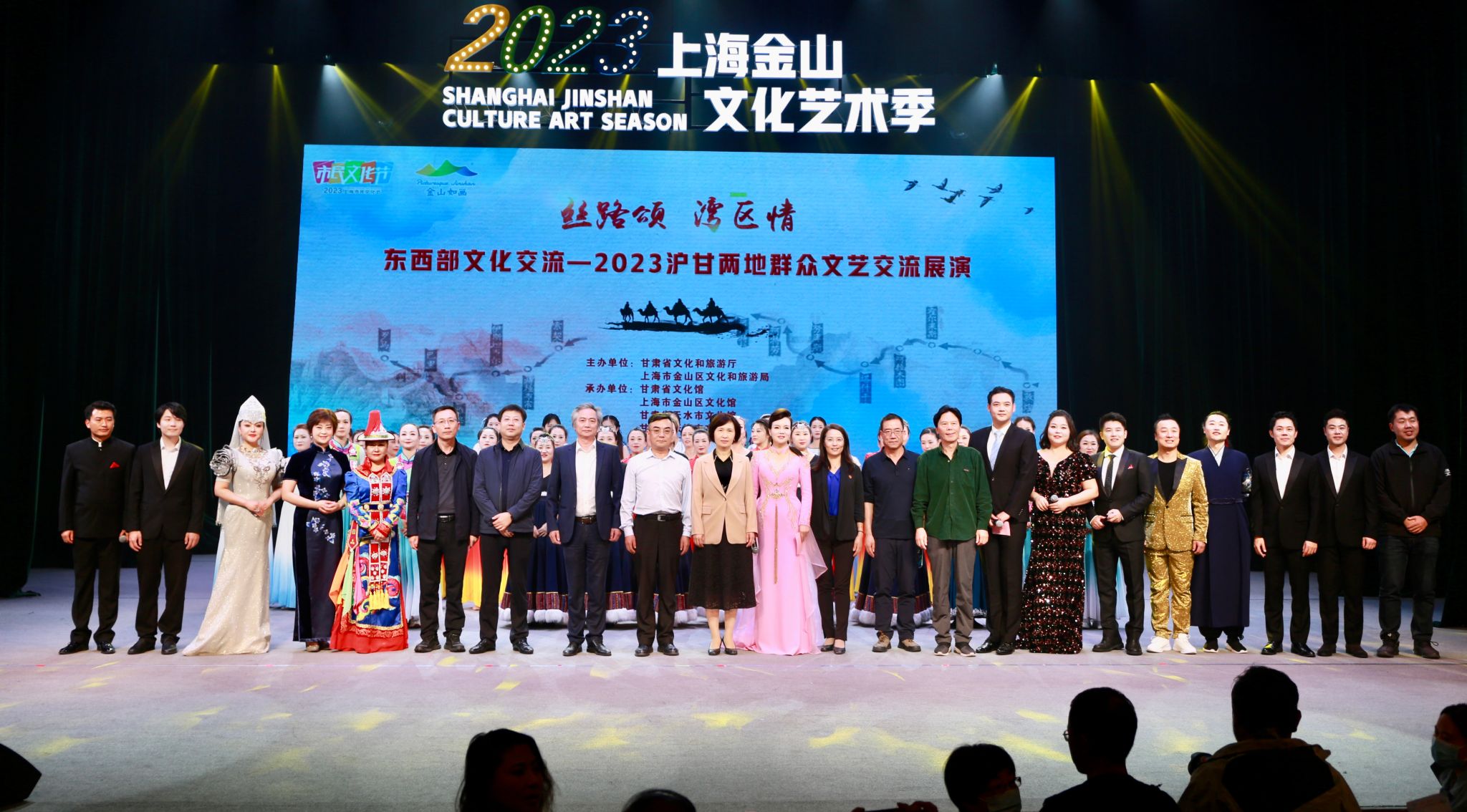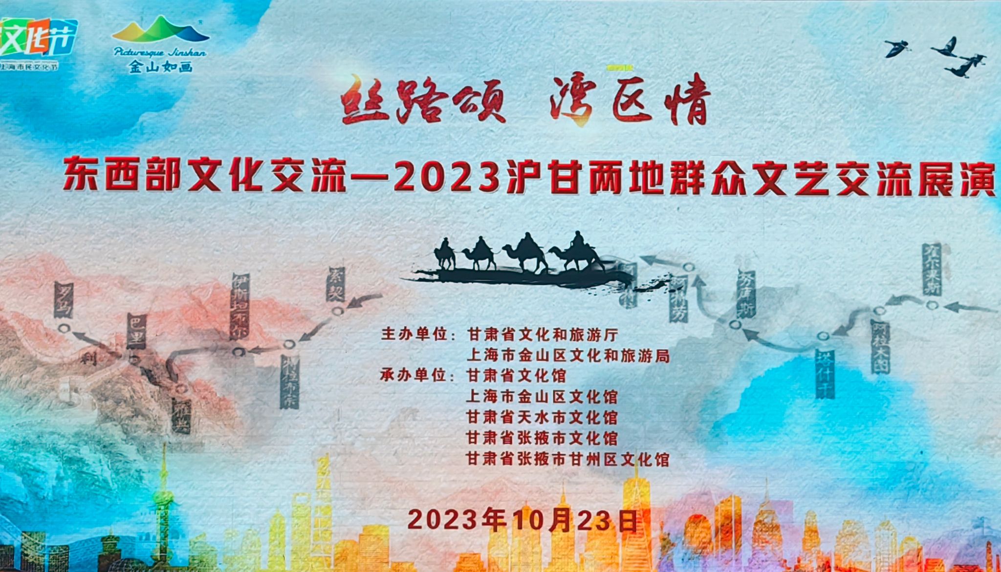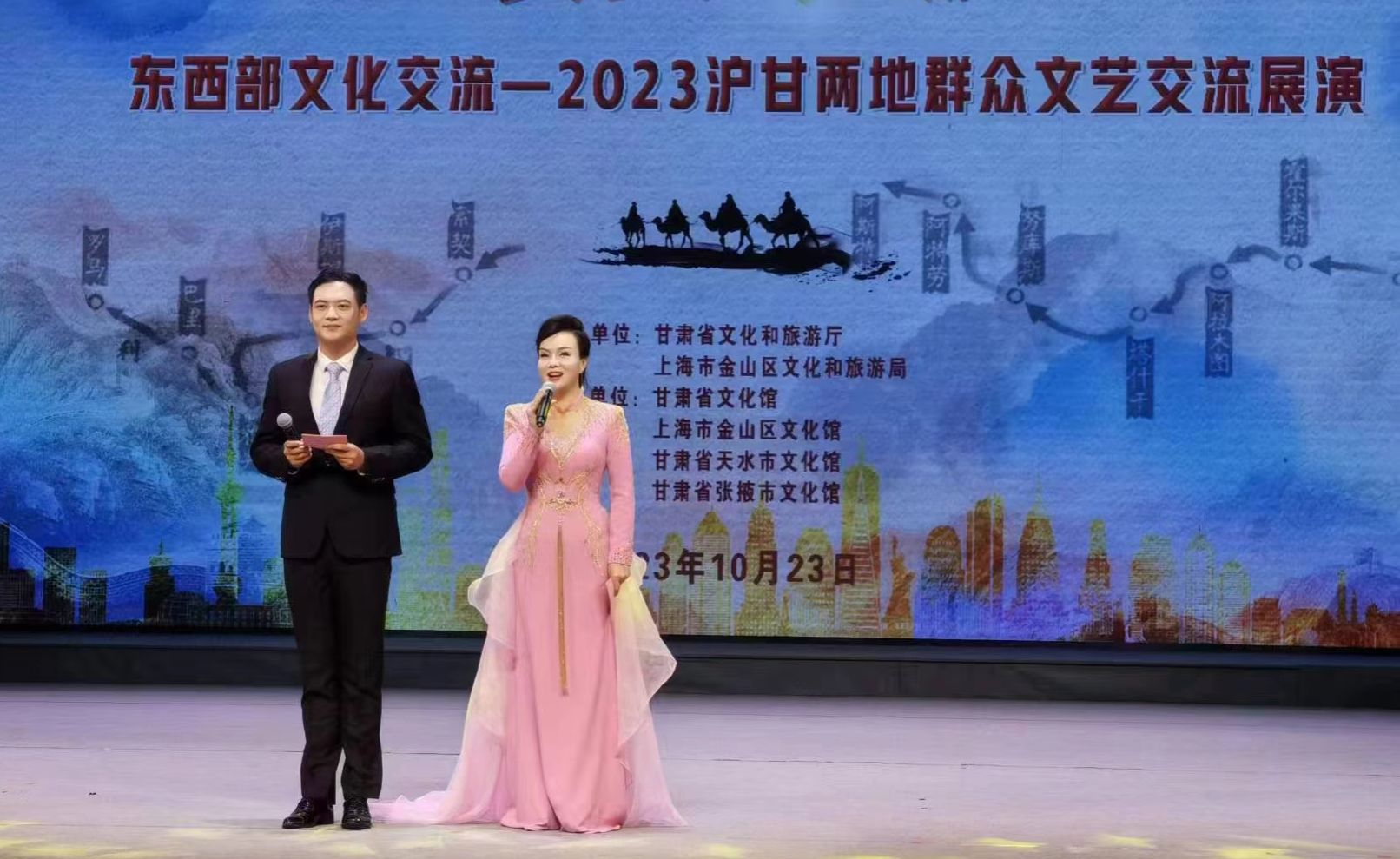 10月23日,为全面贯彻落实党的二十大精神,深入学习贯彻习近平文化思想,促进东西部文化交流,进一步提升公共文化服务水平,由甘肃省文化和旅游厅、上海市金山区文化和旅游局主办,甘肃省文化馆、上海市金山区文化馆、甘肃省天水市文化馆、甘肃省张掖市文化馆、甘肃省张掖市甘州区文化馆承办的“丝路颂 湾区情”东西部文化交流--2023沪甘两地群众文艺交流展演在上海成功举办。